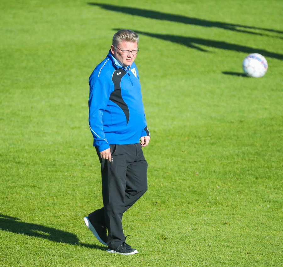Allt að verða tilbúið á Kópavogsvelli. Ejub búinn að raða keilum um allt á öðrum vallarhelmingnum og leikmenn væntanlegir út að hita á hverri mínútu.