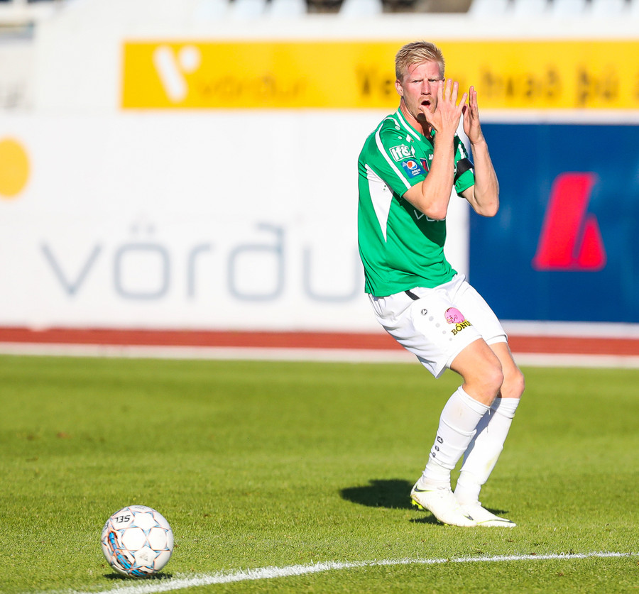 Aron Bjarnason fékk fínt skotfæri rétt fyrir utan vítateig en hitti boltann herfilega illa. Skotið skoppaði framhjá markinu og Aron er ansi pirraður út í sjálfan sig fyrir að hafa ekki gert betur.