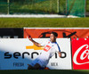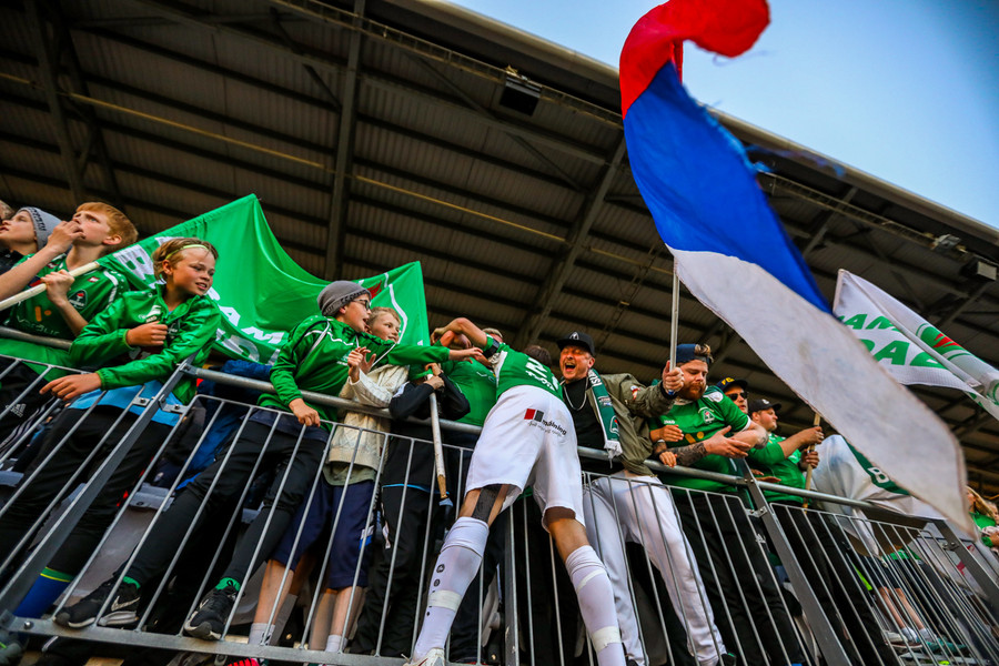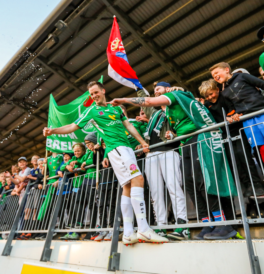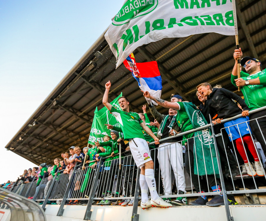 Stuðningsmenn Blika í stuði og Erpur Eyvindarson er með serbneska fánann. Mikil gleði.