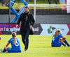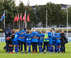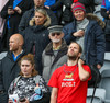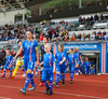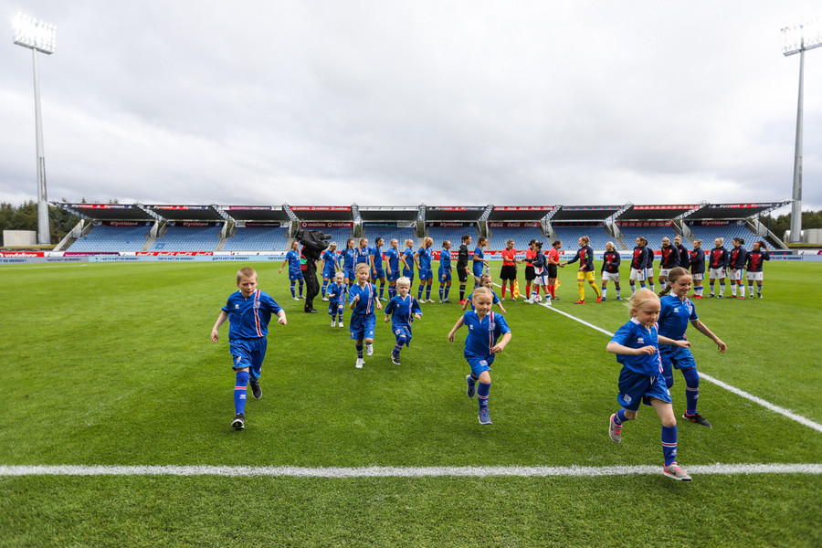 Liðin ganga út á völlinn. Hér er topp fótboltaveður, eiginlega bara sól og blíða. Ánægð með fólkið sem sagði upp vinnunni og er komið á völlinn! Þetta verður geggjað