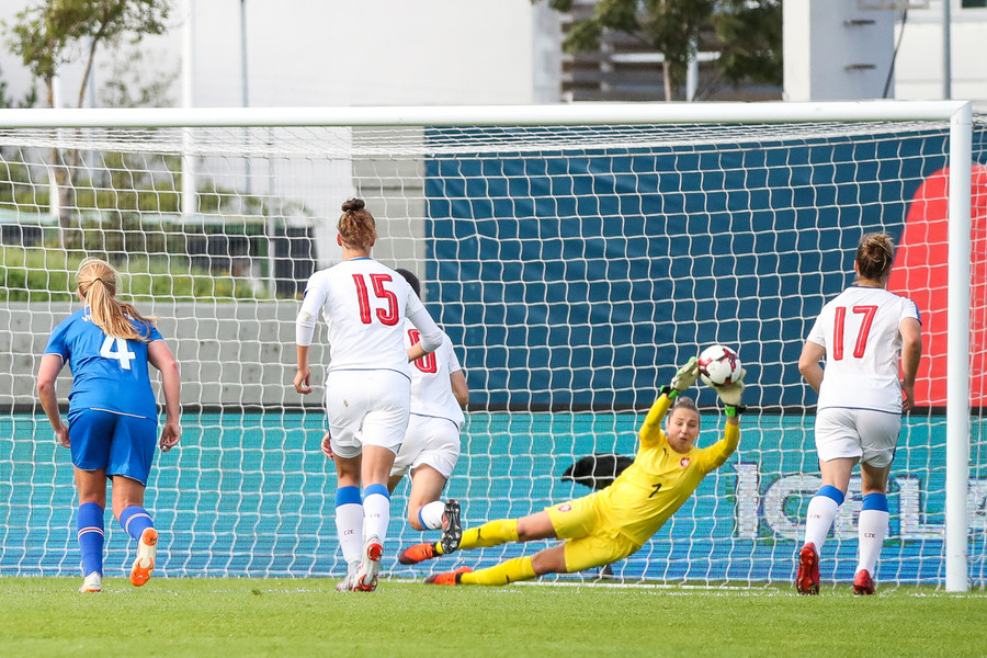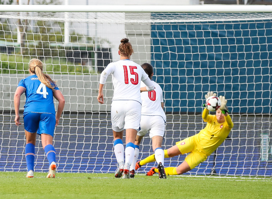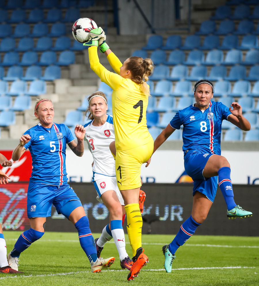 Andrea kemur inn þegar Tékkland gerir sig líklegar til að taka aukaspyrnu. Svitkóva lætur vaða á markið frá miðju en Gugga á ekki í neinum vandræðum með þennan