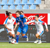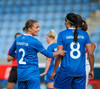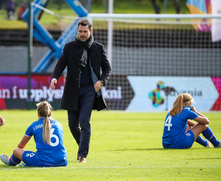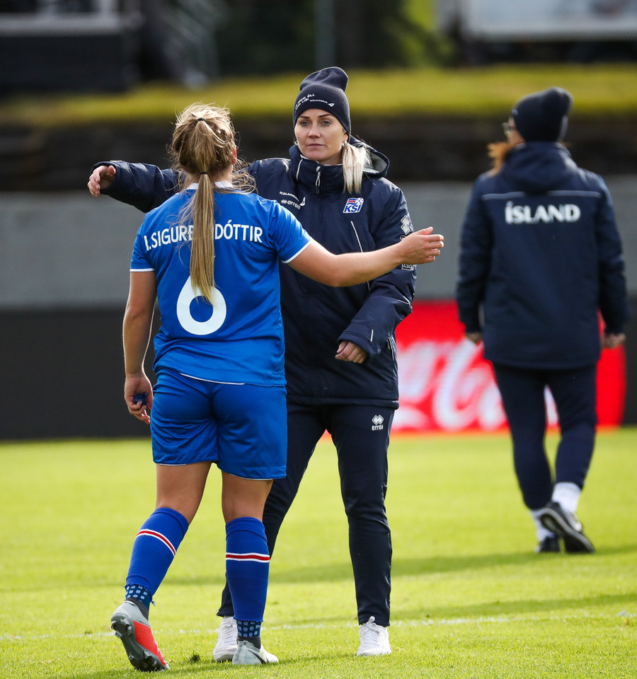 Ísland heldur boltanum ágætlega núna. Glódís skiptir honum út til hægri yfir á Selmu Sól sem er í fínni fyrirgjafastöðu og kemur með hann inn í. Þetta fer hinsvegar hátt yfir Fanndísi vinstra megin. Það vantaði fleiri möguleika fyrir Selmu þarna, ágætis möguleiki