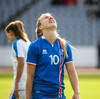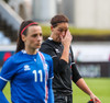 Stelpurnar strax komnar í sókn. Ingibjörg með fyrirgjöf frá hægri yfir á teiginn. Fanndís nær skalla og þessi er í ofanverða slána! Koma svo-jafna sem fyrst