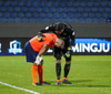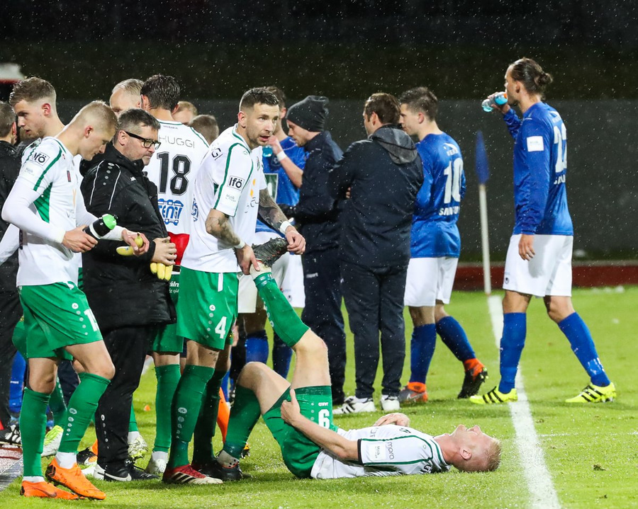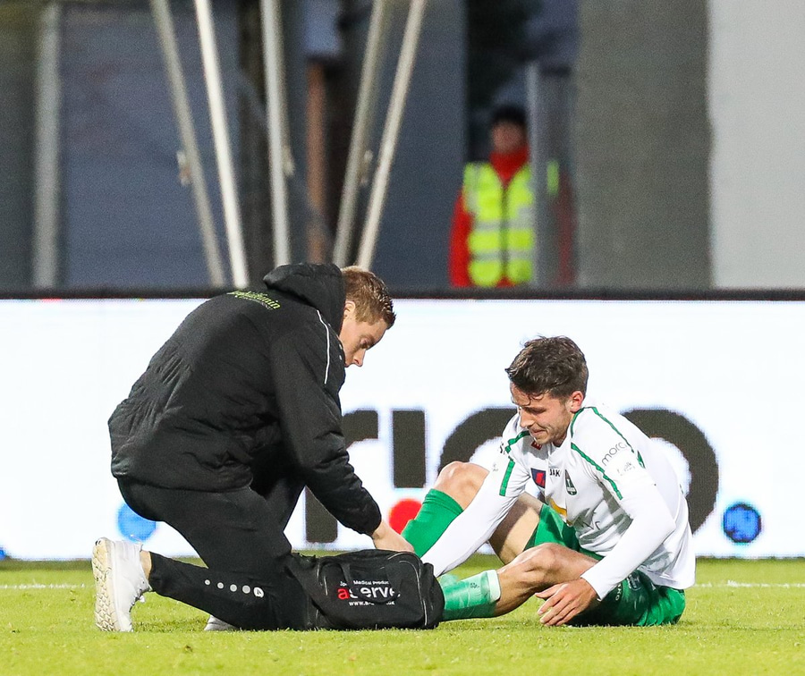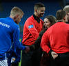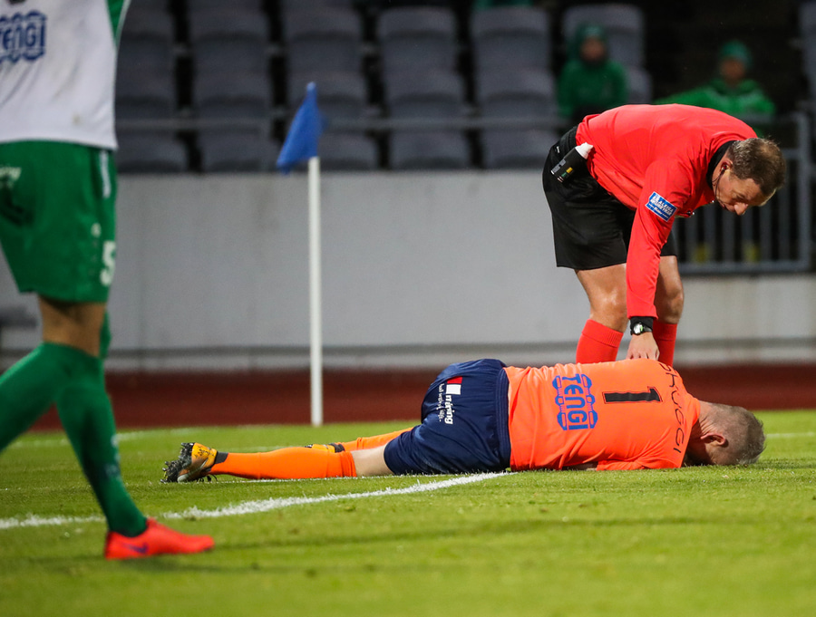 Hendrickx liggur hér eftir á vellinum, fyrri hálfleikur hefur einkennst af því að menn liggja eftir, vonandi er í lagi með hann.