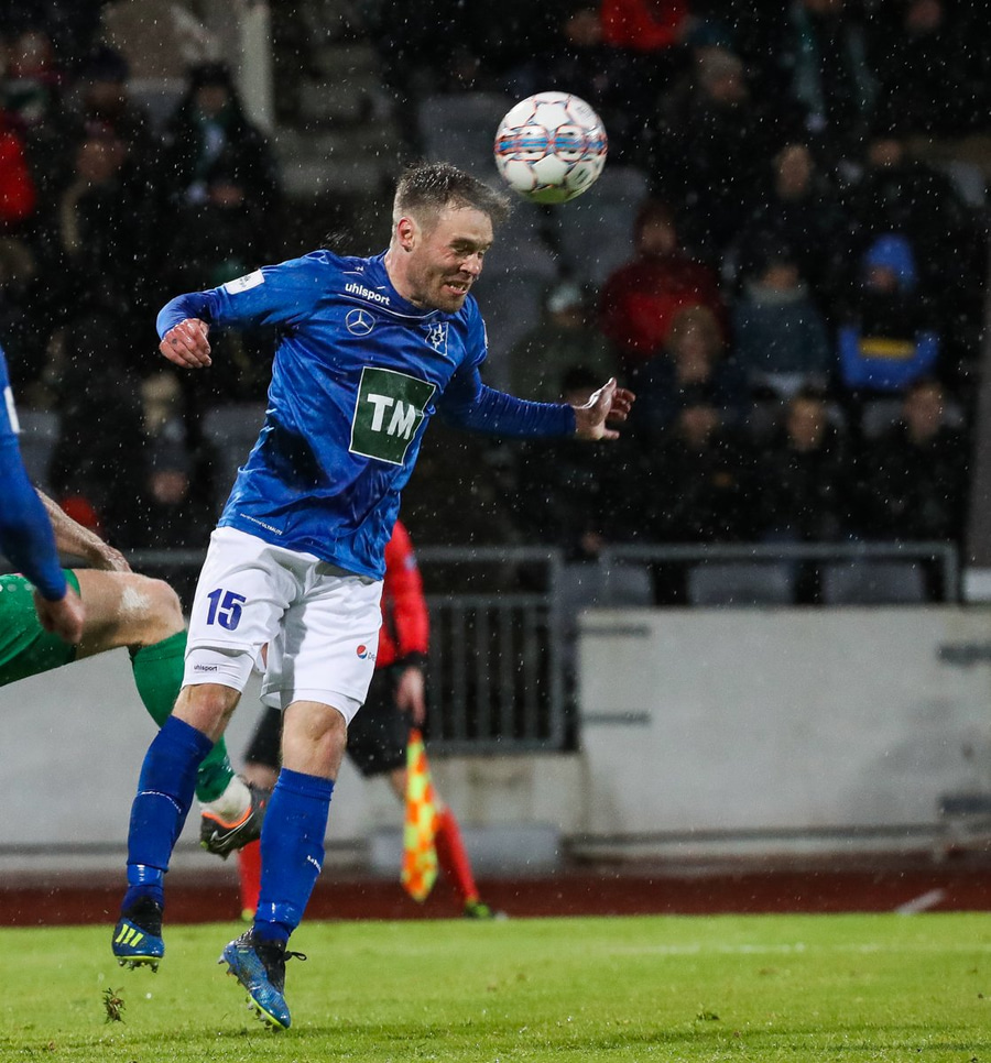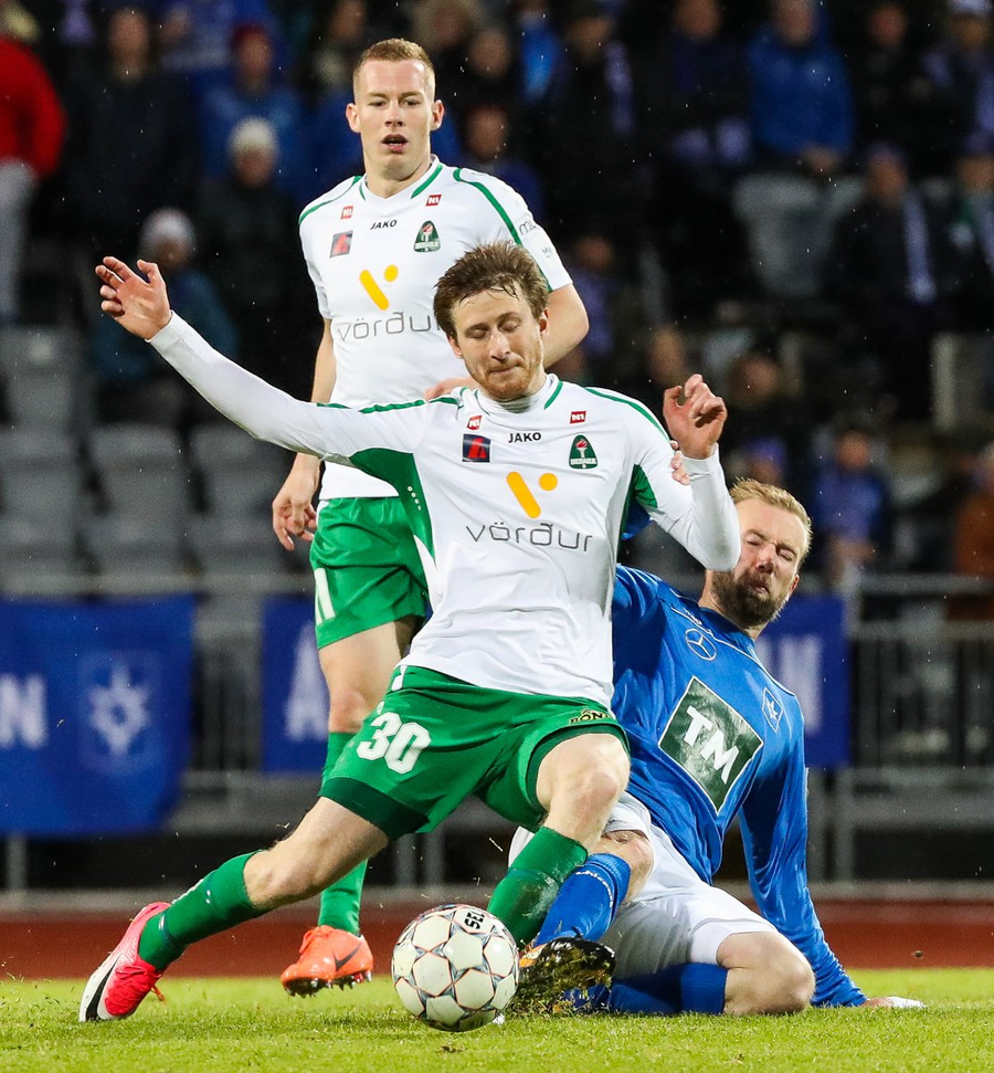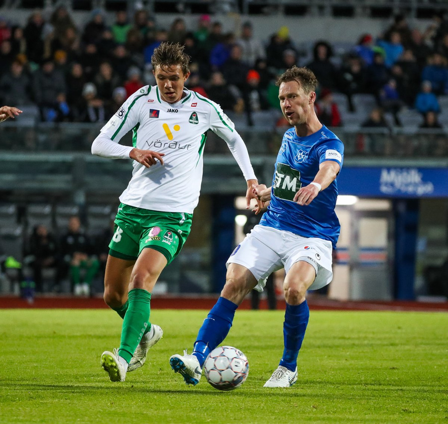 Þorsteinn Már á leiðinni upp kantinn en Davíð nær að trufla hann og fyrirgjöf Þorsteins er ömurleg, beint útaf.