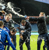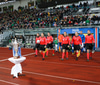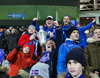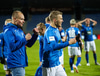Liðin ganga nú á inná völlinn við mikinn fögnuð áhorfenda, Þóroddur Hjaltalín og hans teymi leiða línuna, þetta fer að byrja!