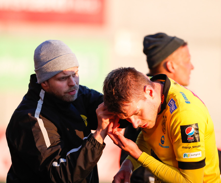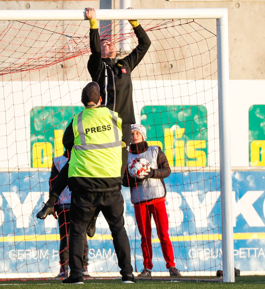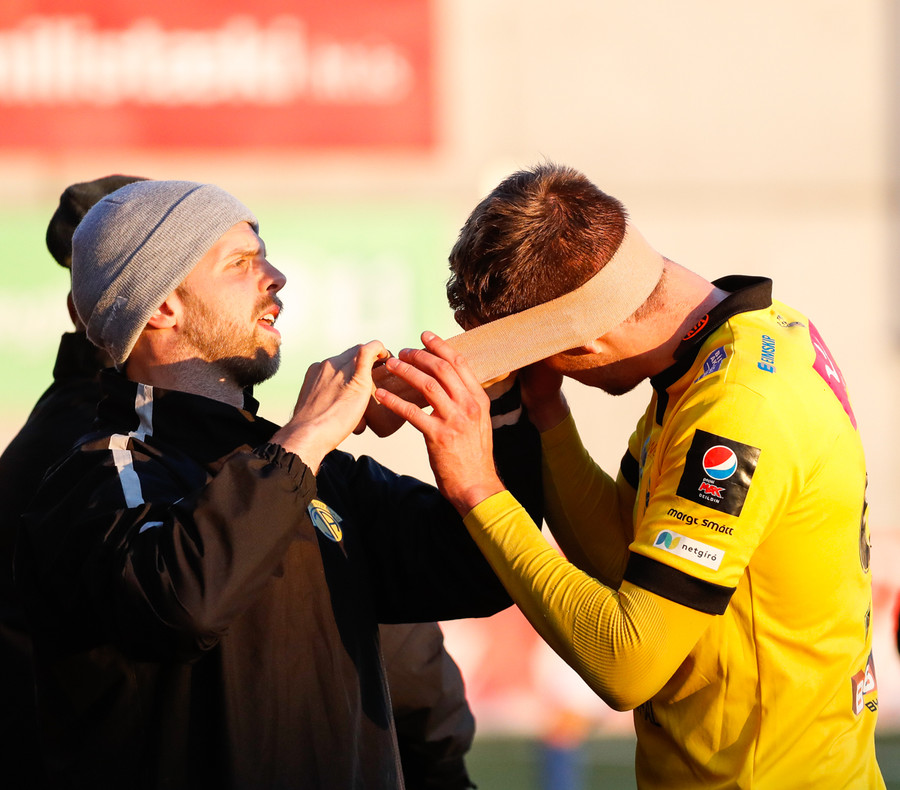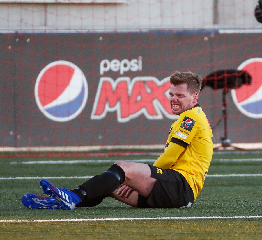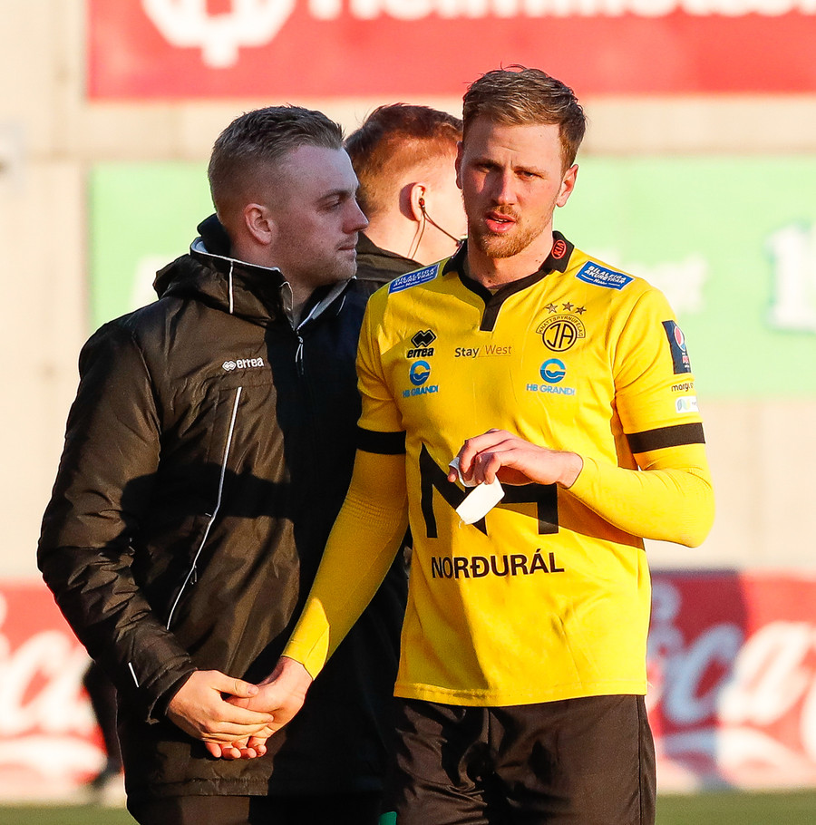 Lyng meiddist aftan í læri í skotinu og þarf að fá skiptingu. Kaj Leo býr sig undir að koma inn.