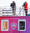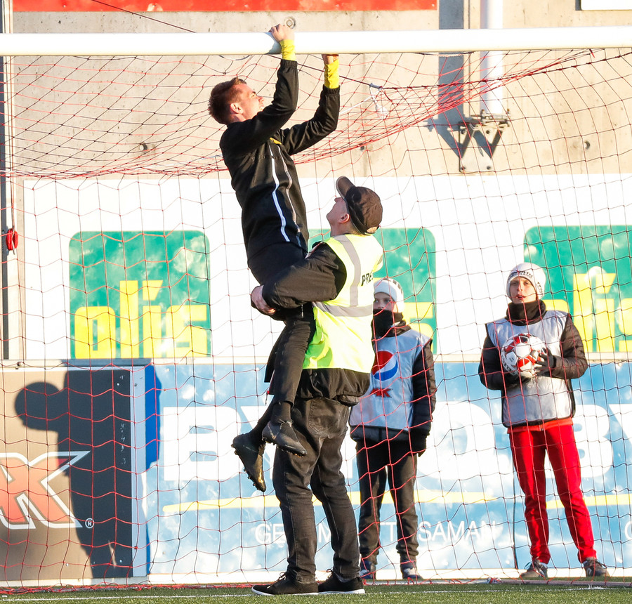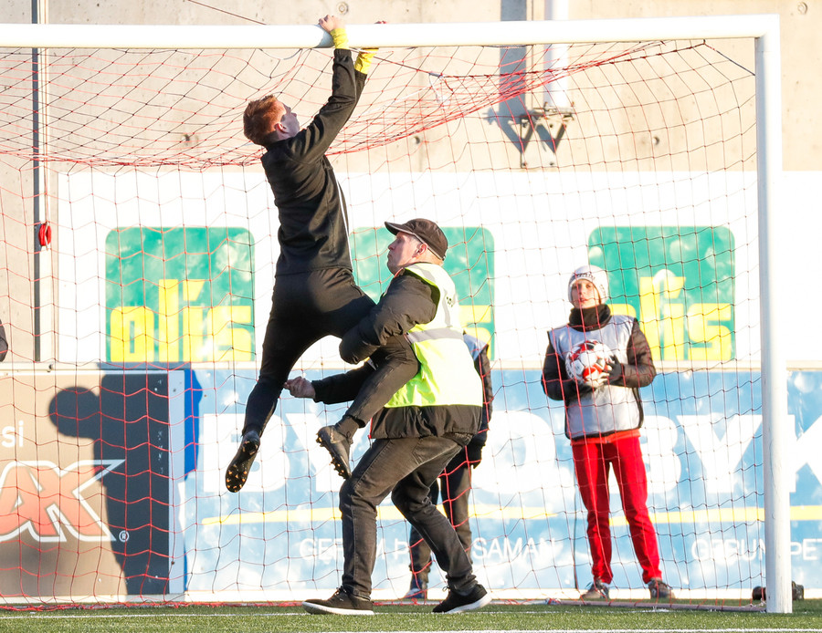 Þórður Þorsteinn Þórðarson aðstoðar og lagar netið með hjálp frá vallarstarfsmanni sem hélt á honum. Kostulegt atvik! En vel gert hjá ÞÞÞ!