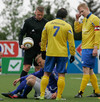Glæsileg fyrirgjöf frá hægri og beint á kollinn á Tryggva Svein sem stangar boltann rétt framhjá. Eitthvað að lifna yfir þessu, en það getur ekki versnað.
