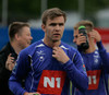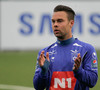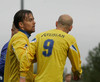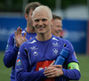 Liðin eru hér bæði út á velli og hita sig upp. Gróttumenn gefa sín á milli meðan Stjörnumenn eru í liðkunaræfingum. Skemmtilegt nokk.
