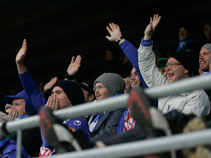Fékk sendingu í gegn og afgreiddi færið frábærlega. Stuðningsmenn Gróttu í stúkunni fagna ákaft.