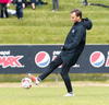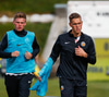 Liðin eru að ljúka upphitun, það er orðið skýjað og þokkalegur vindur.