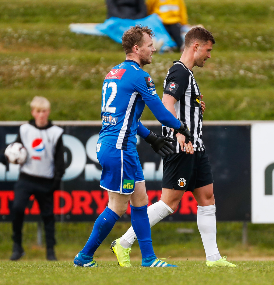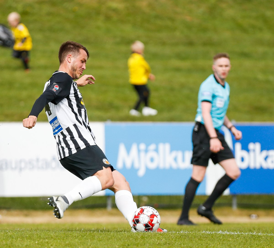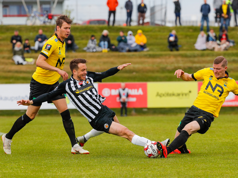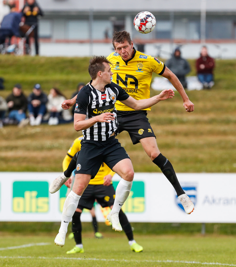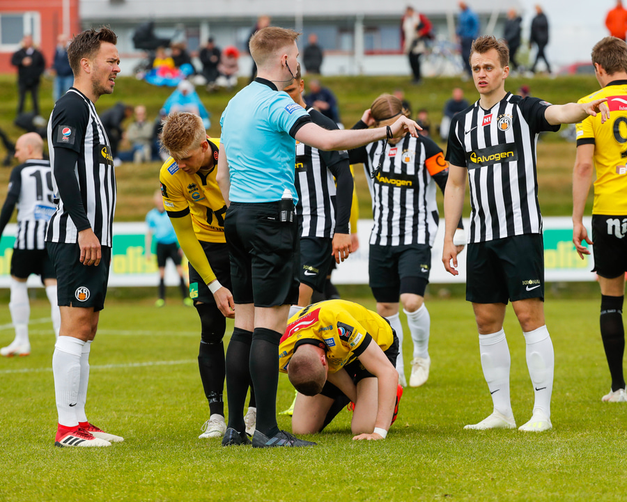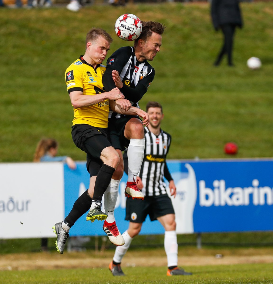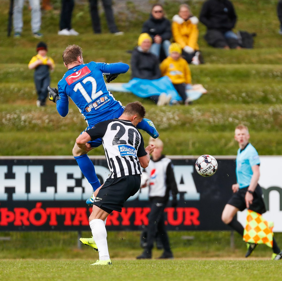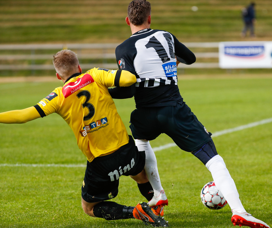 Skagamenn byrja á að lúðra boltanum upp og Arnór Snær fer í tæklingu og er tæklaður sömuleiðis af Arnþóri Inga rétt fyrir utan teiginn.