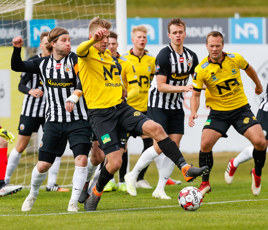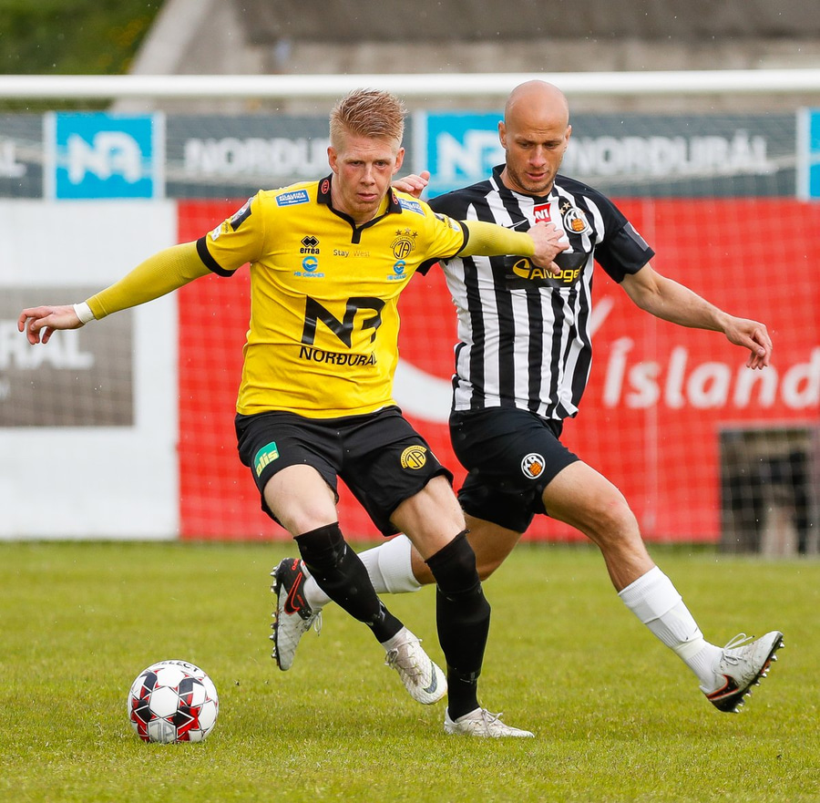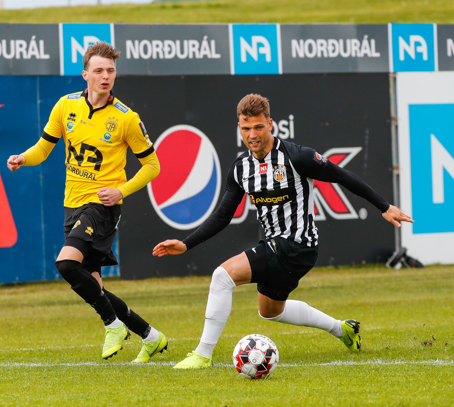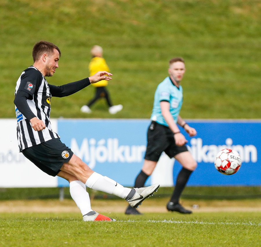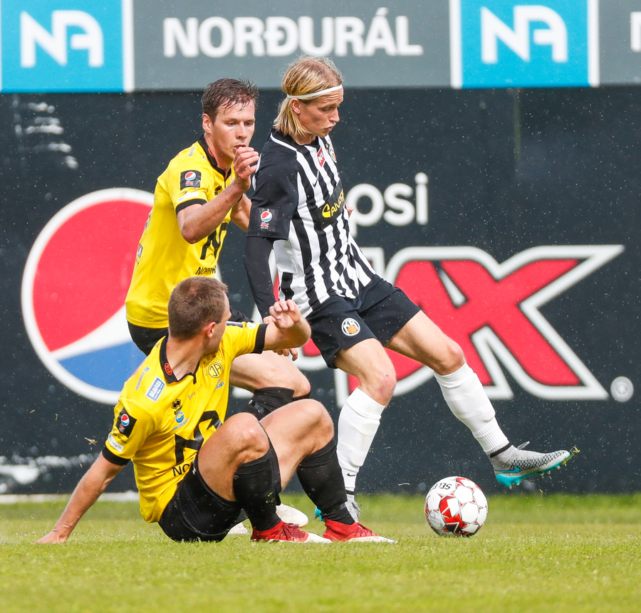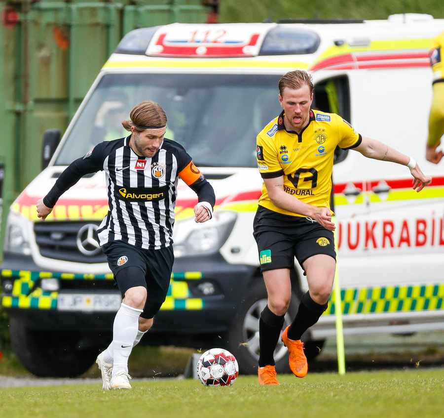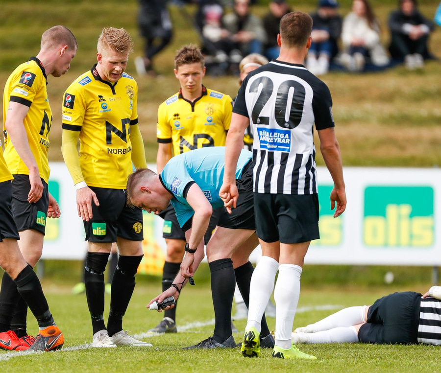 Skagamenn byrja á að lúðra boltanum upp og Arnór Snær fer í tæklingu og er tæklaður sömuleiðis af Arnþóri Inga rétt fyrir utan teiginn.