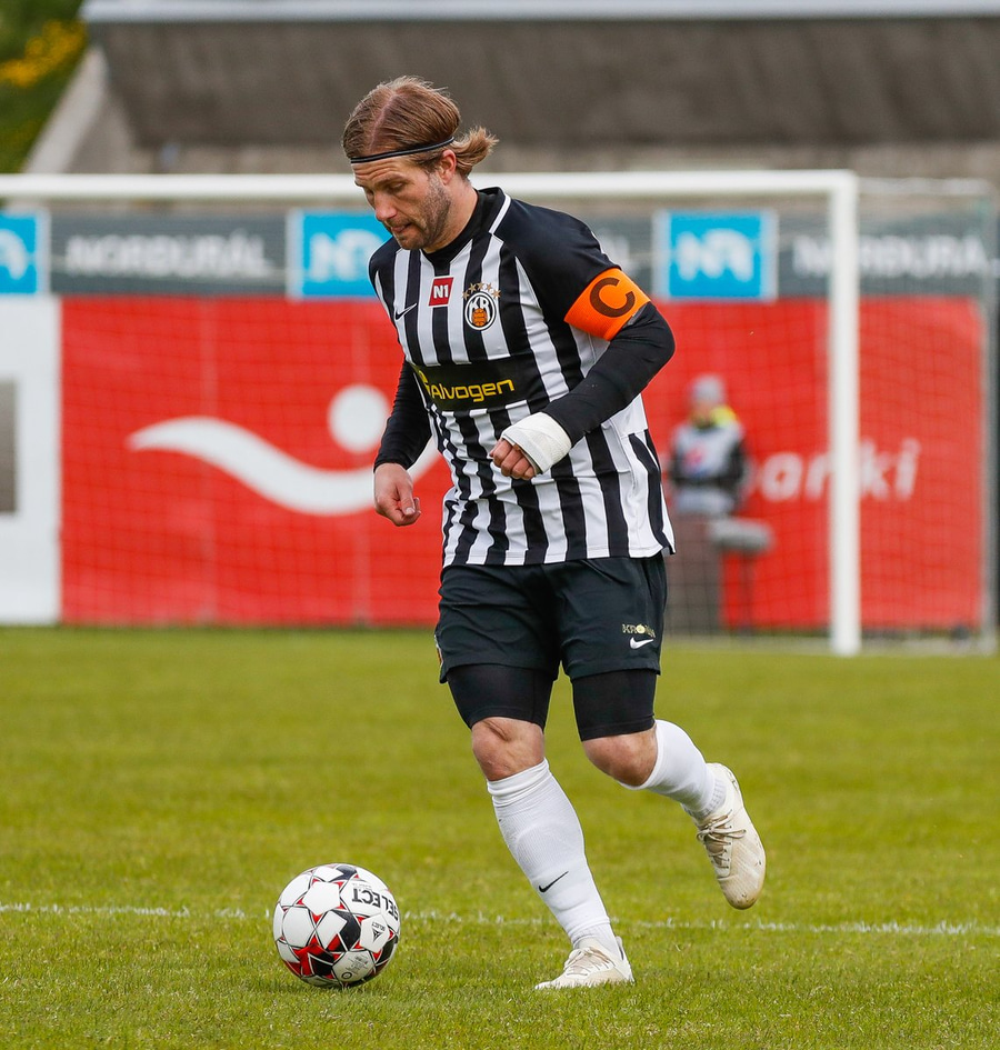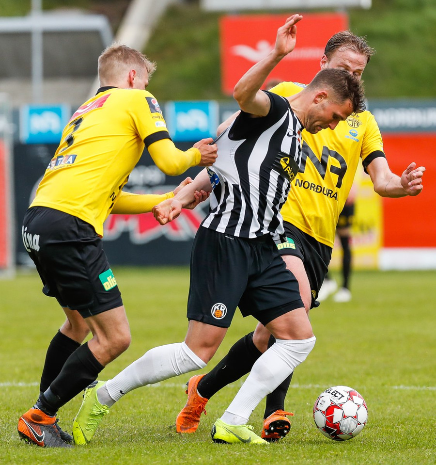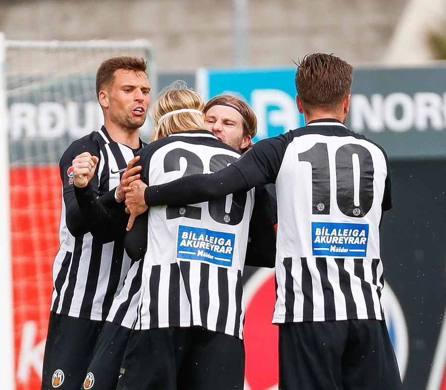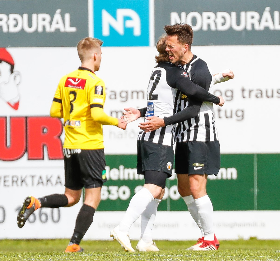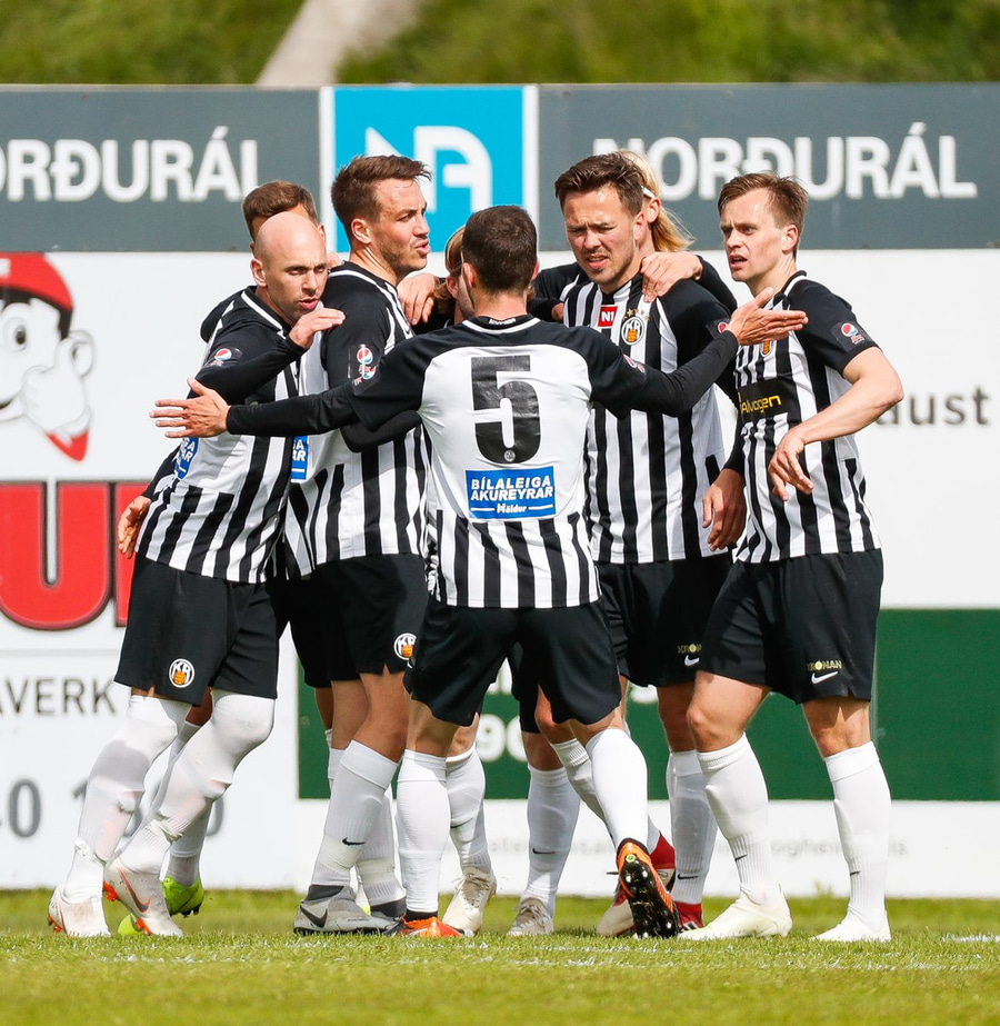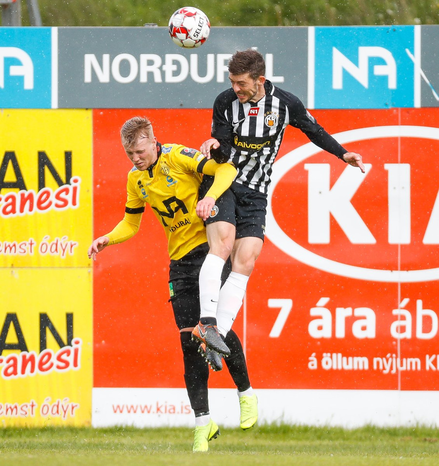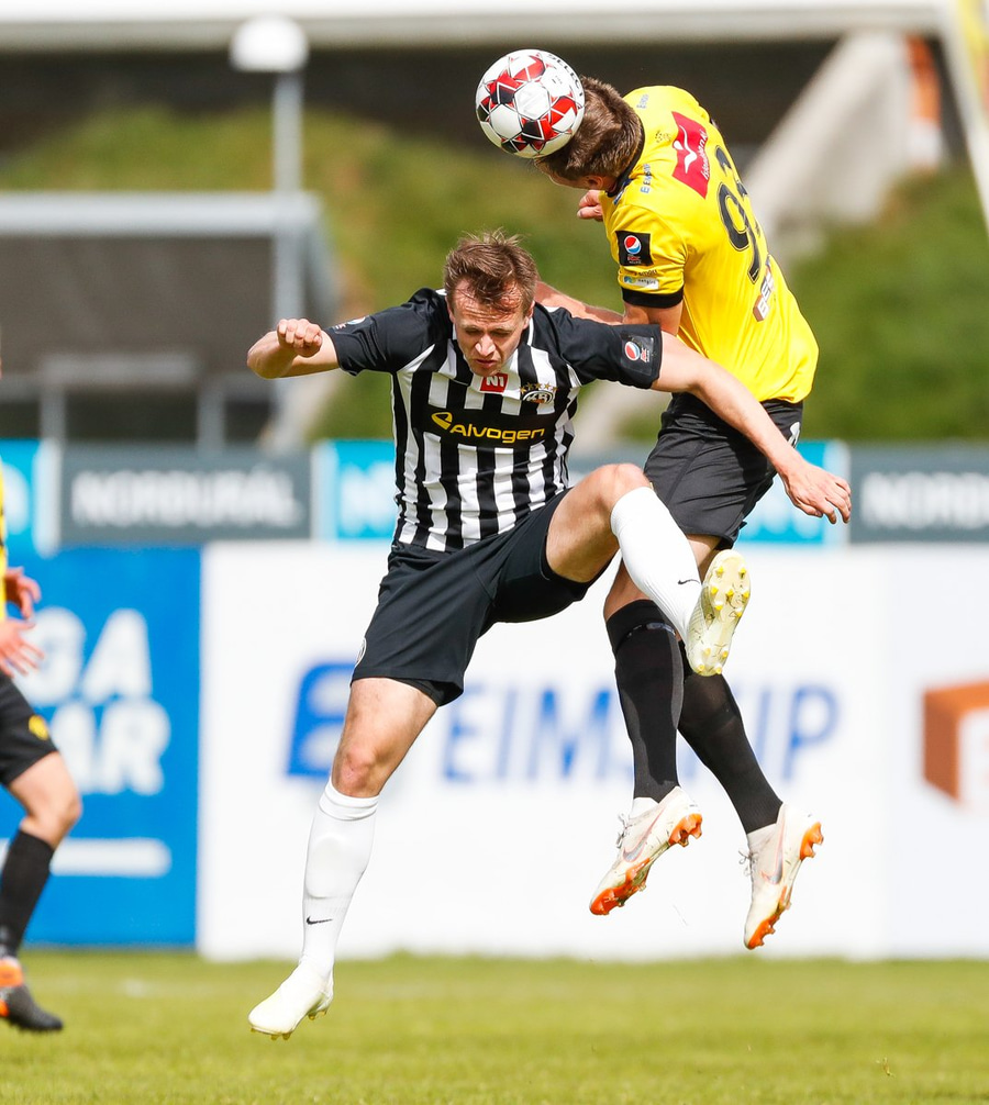 Skagamenn byrja á að lúðra boltanum upp og Arnór Snær fer í tæklingu og er tæklaður sömuleiðis af Arnþóri Inga rétt fyrir utan teiginn.