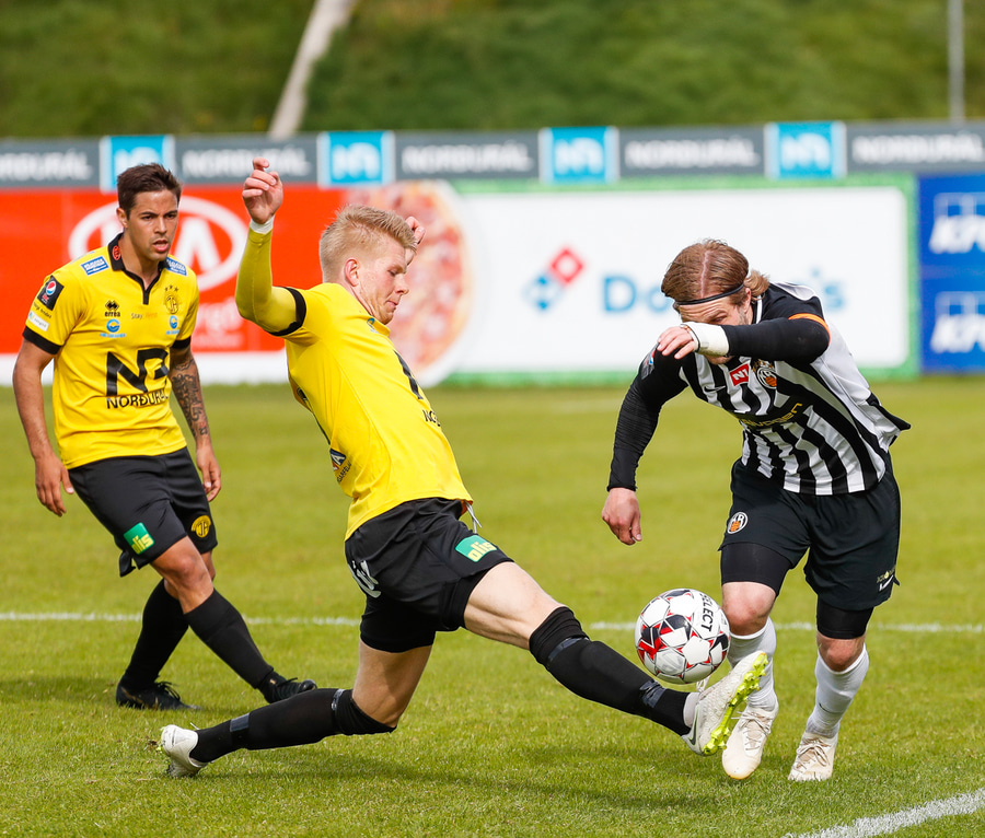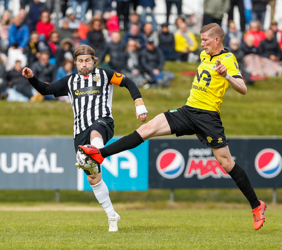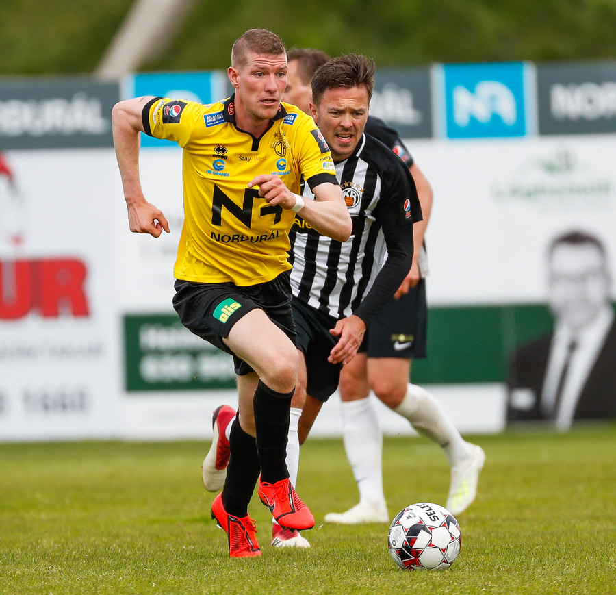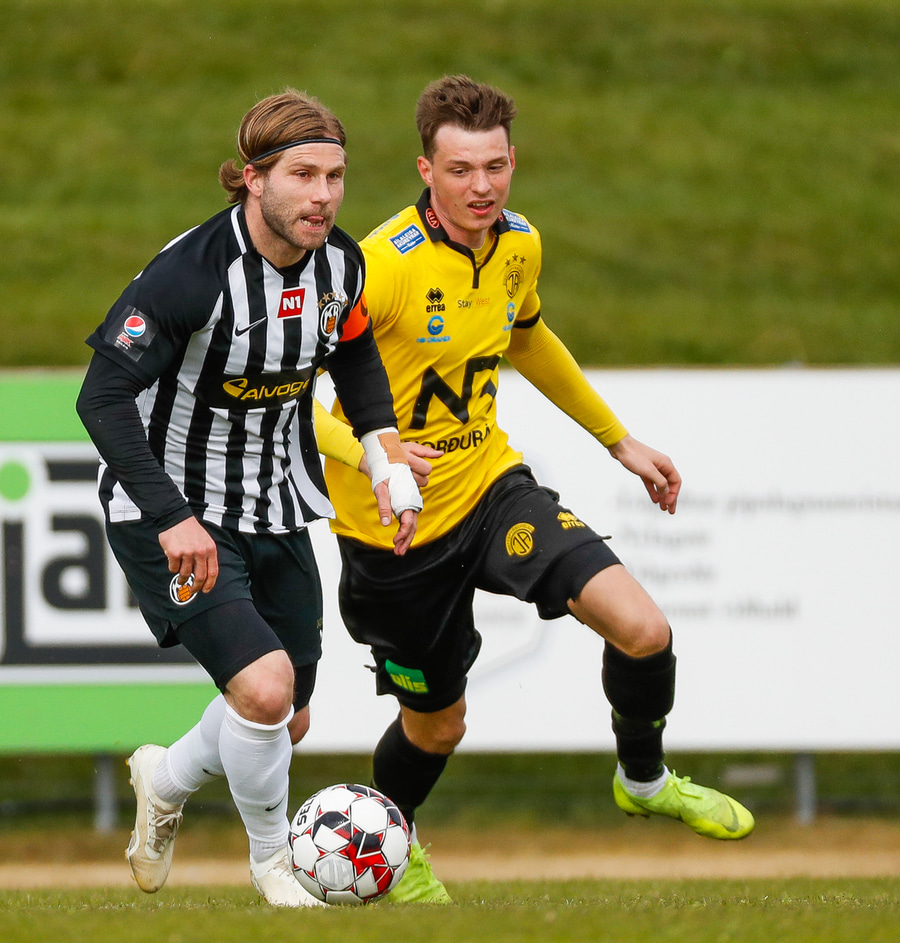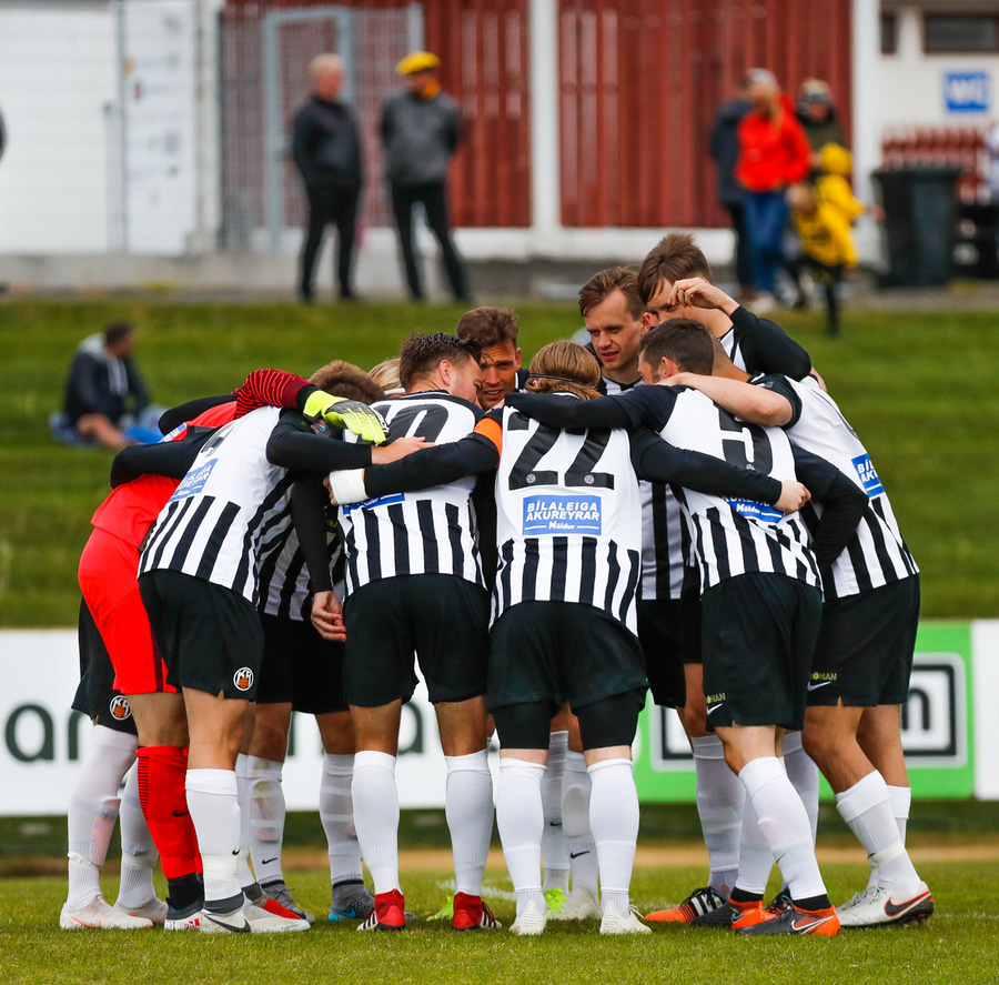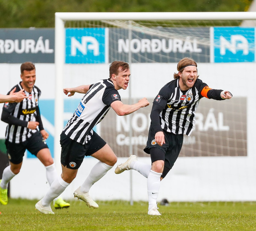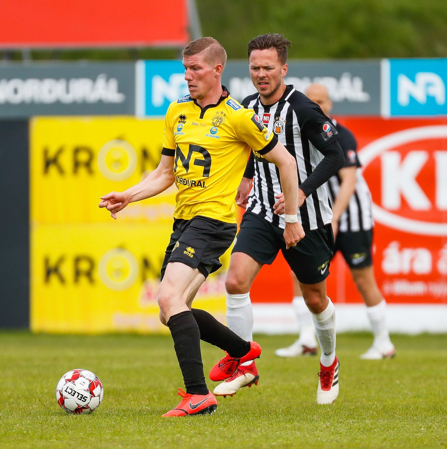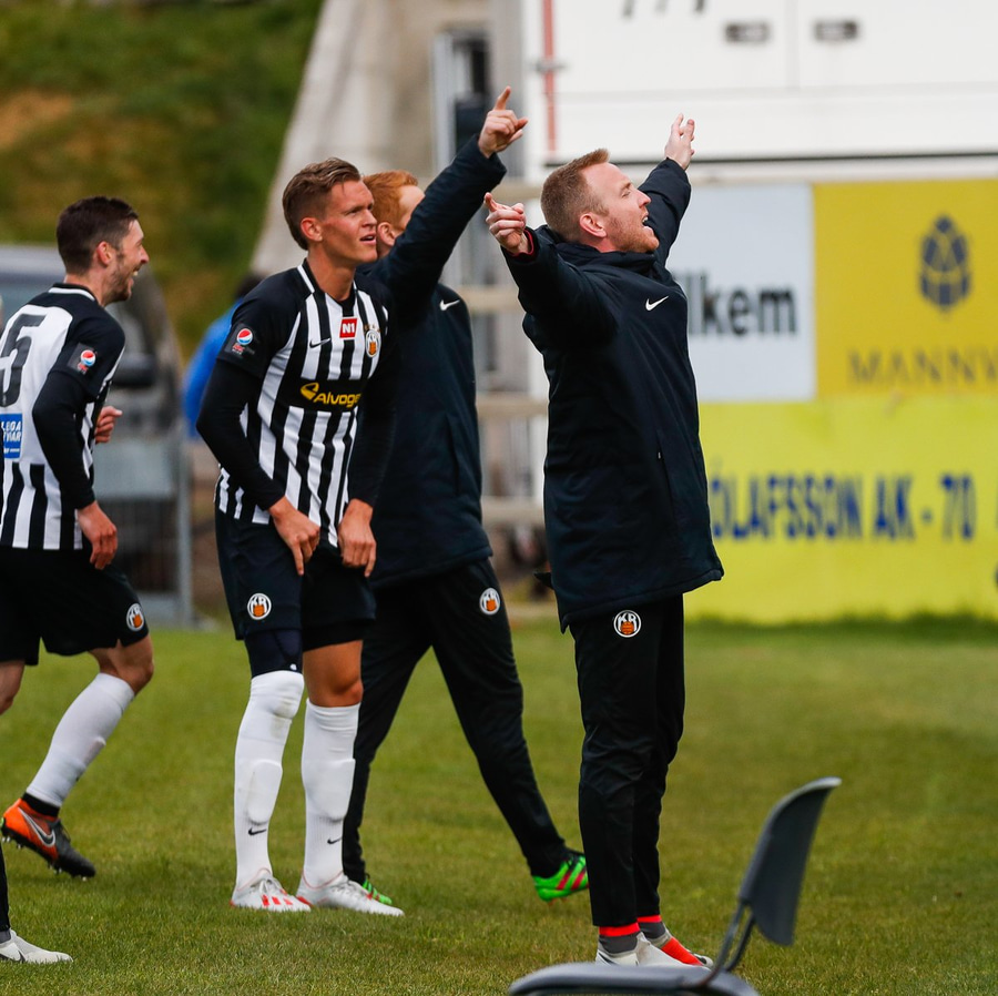 Skagamenn byrja á að lúðra boltanum upp og Arnór Snær fer í tæklingu og er tæklaður sömuleiðis af Arnþóri Inga rétt fyrir utan teiginn.