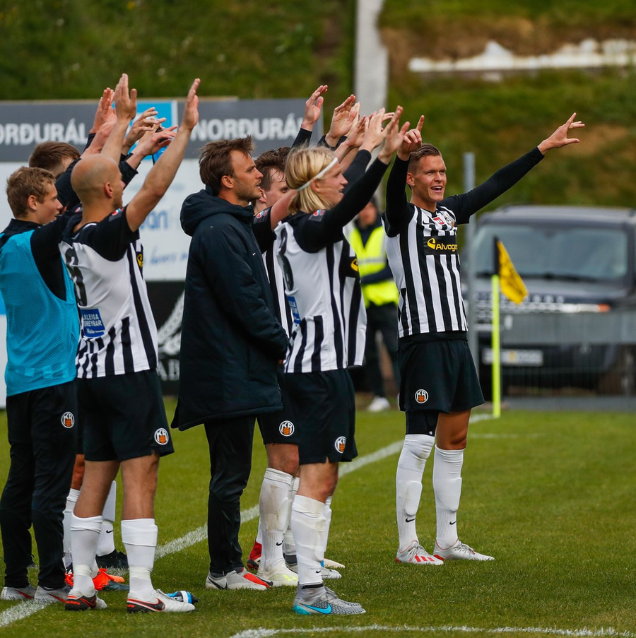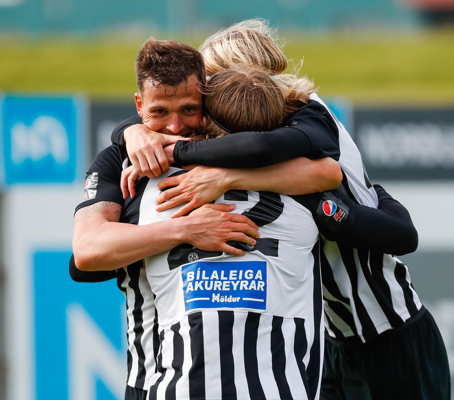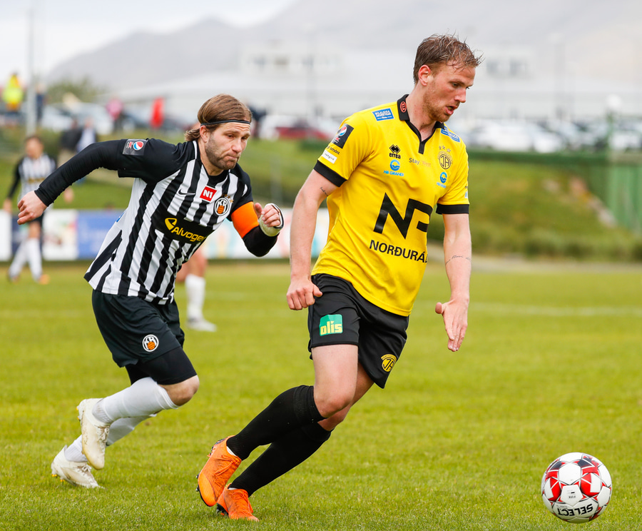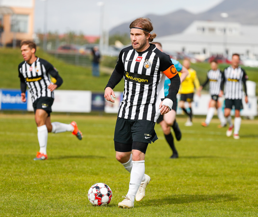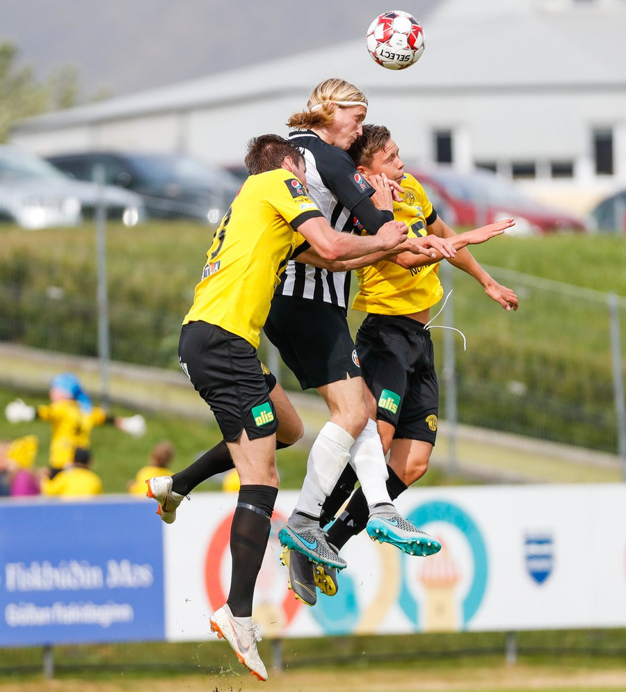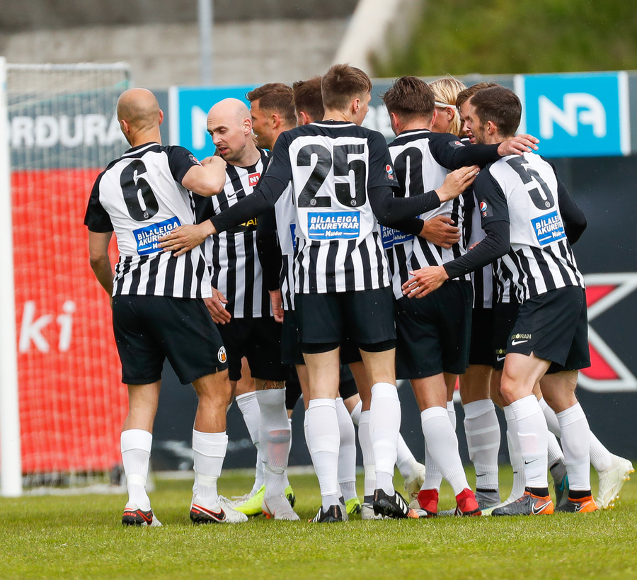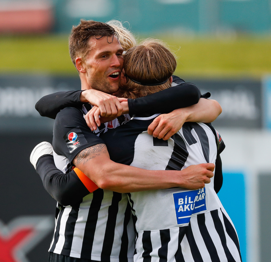 Skagamenn byrja á að lúðra boltanum upp og Arnór Snær fer í tæklingu og er tæklaður sömuleiðis af Arnþóri Inga rétt fyrir utan teiginn.