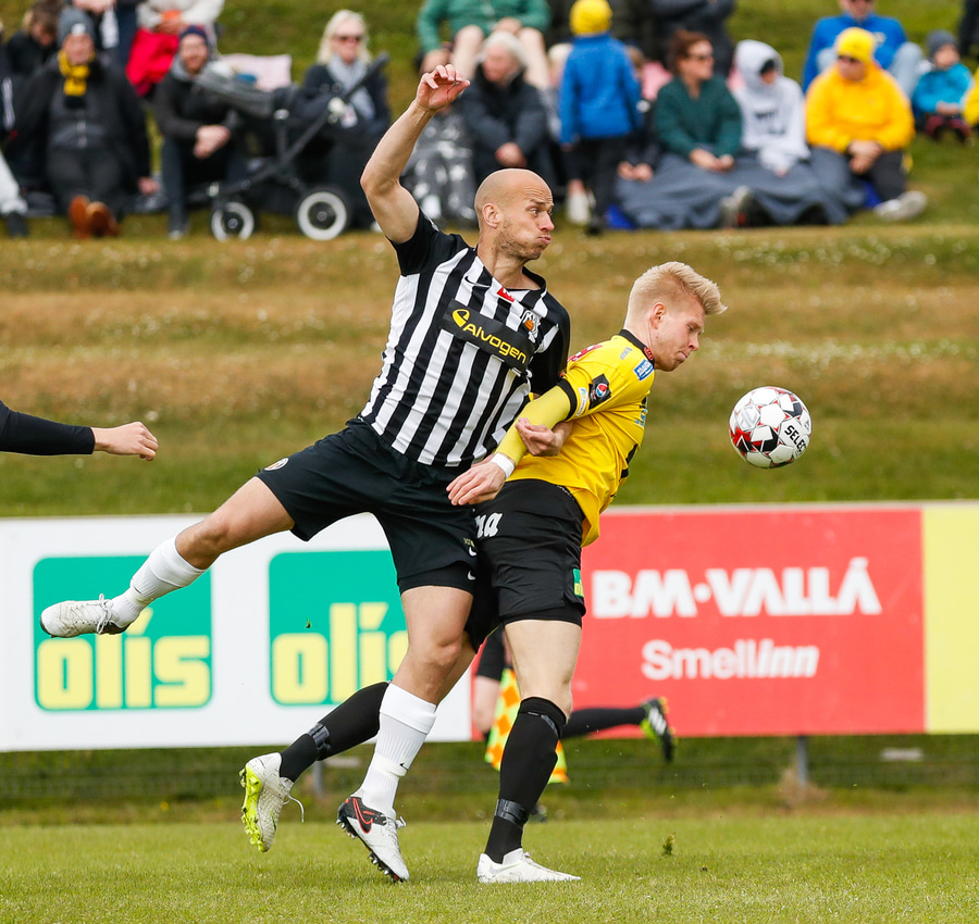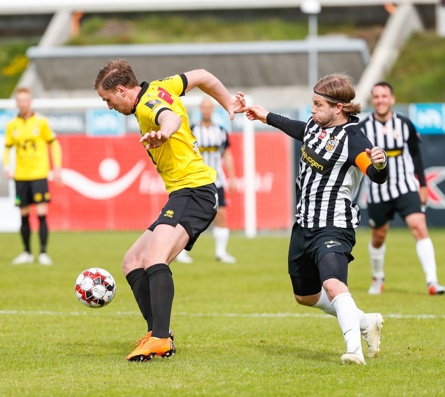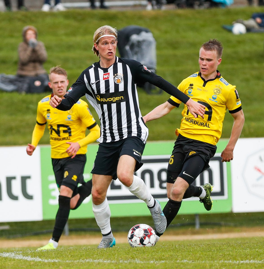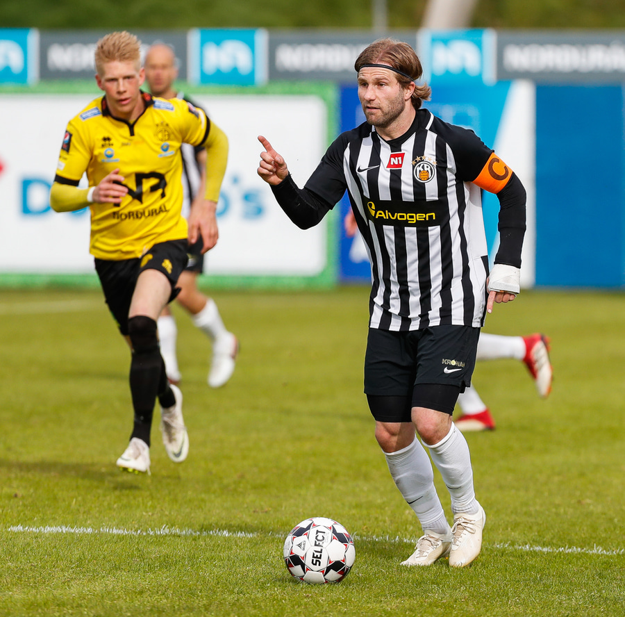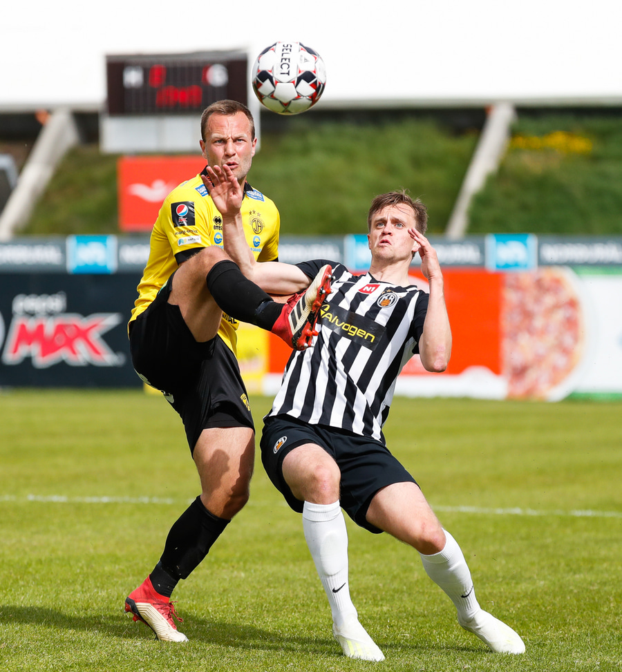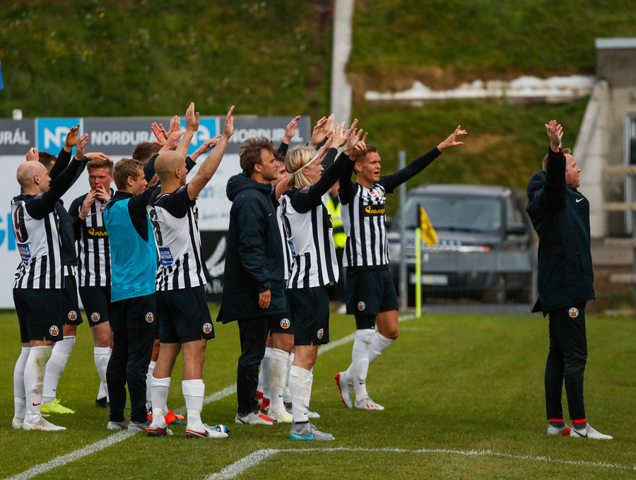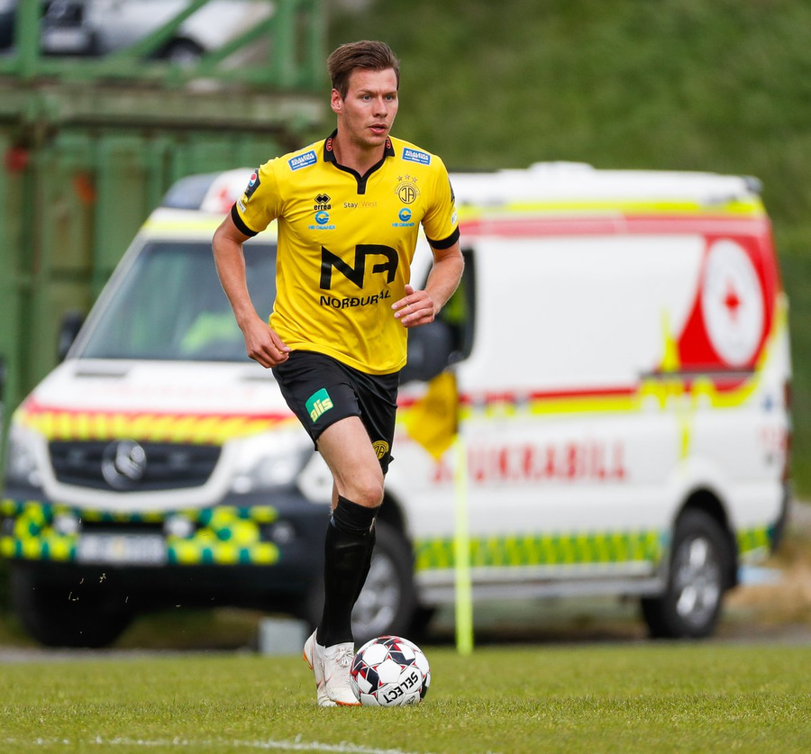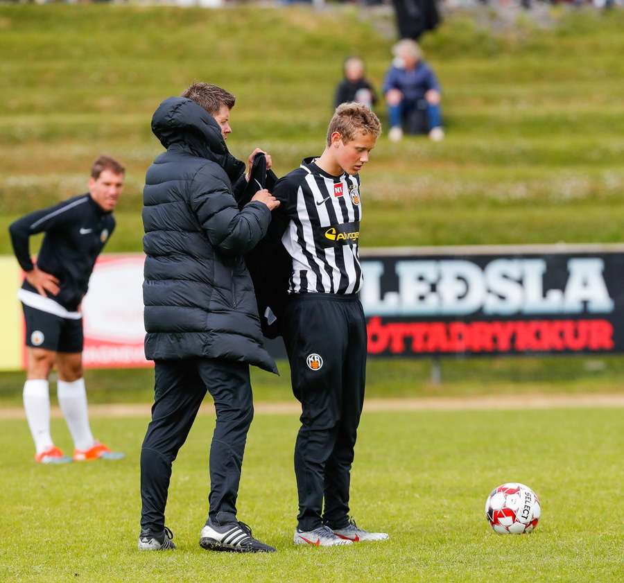 Skagamenn byrja á að lúðra boltanum upp og Arnór Snær fer í tæklingu og er tæklaður sömuleiðis af Arnþóri Inga rétt fyrir utan teiginn.