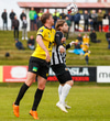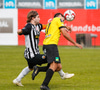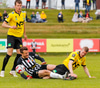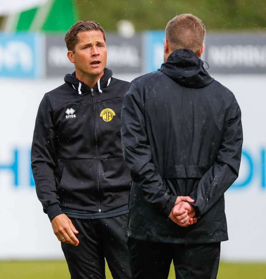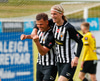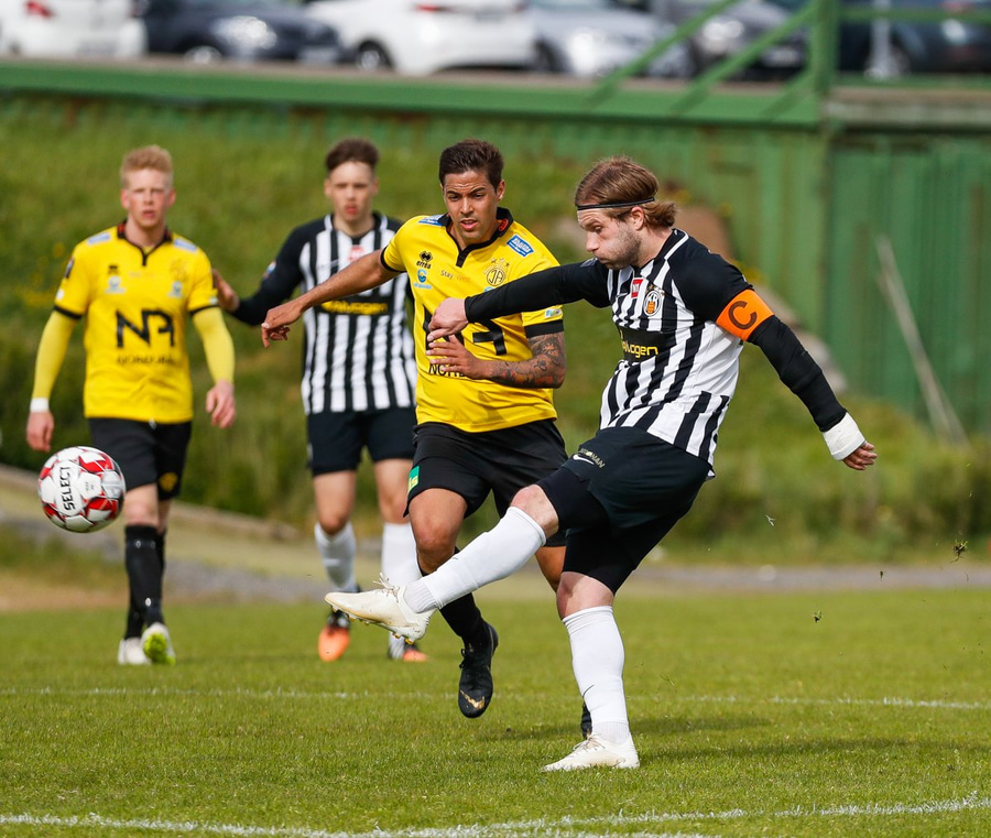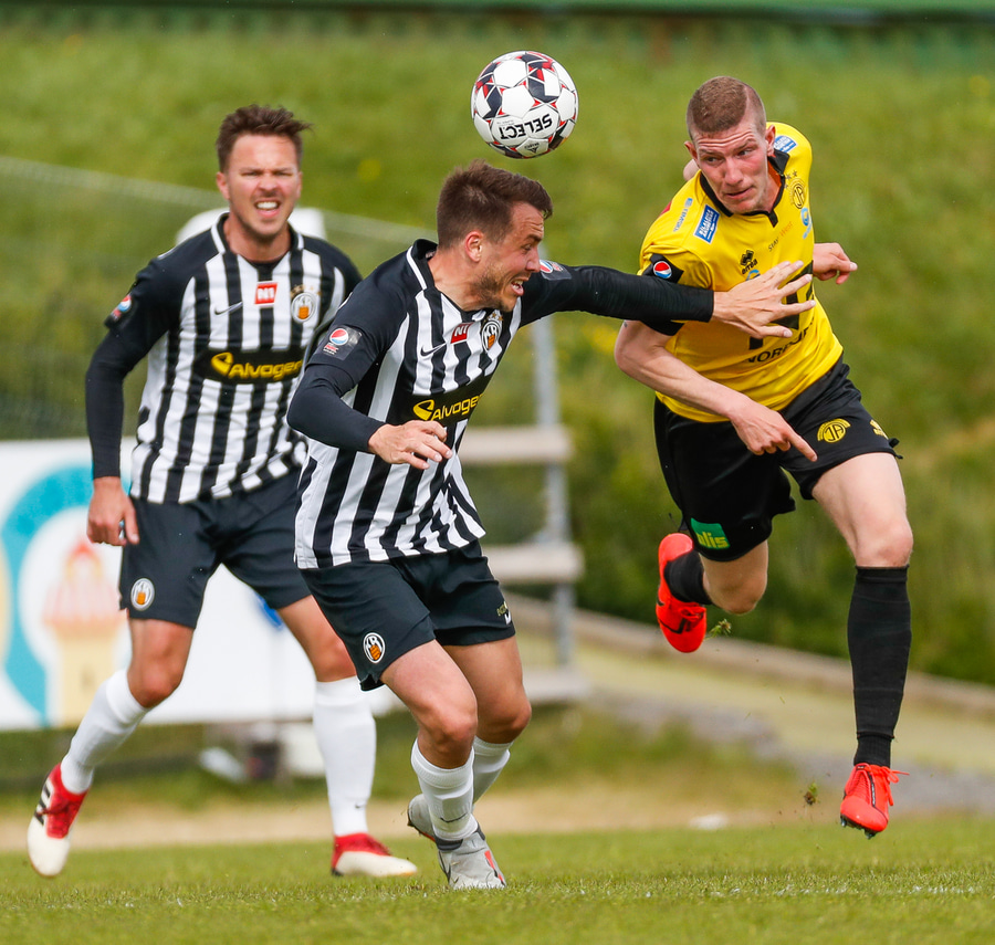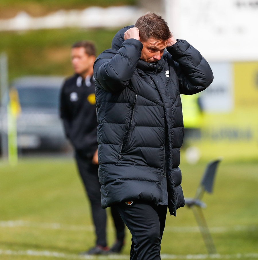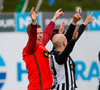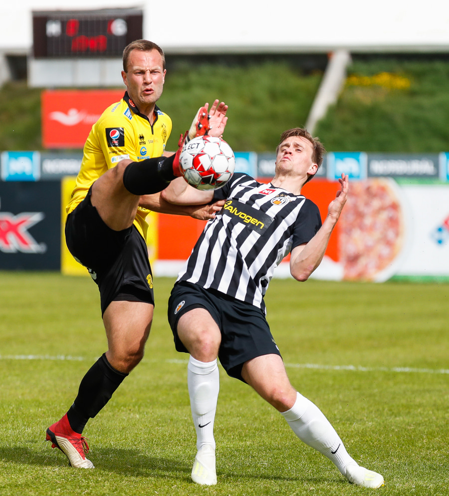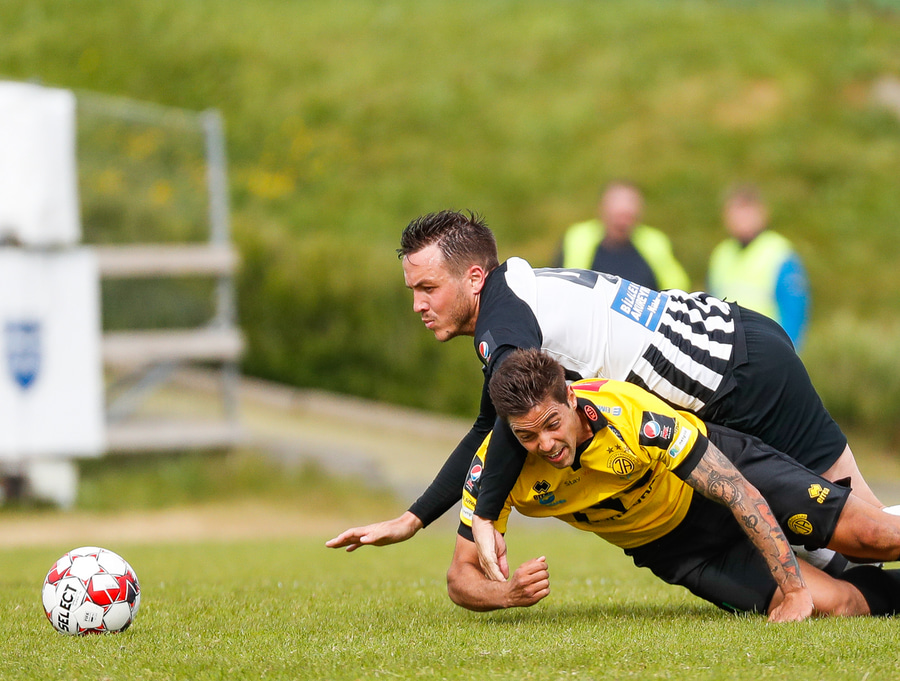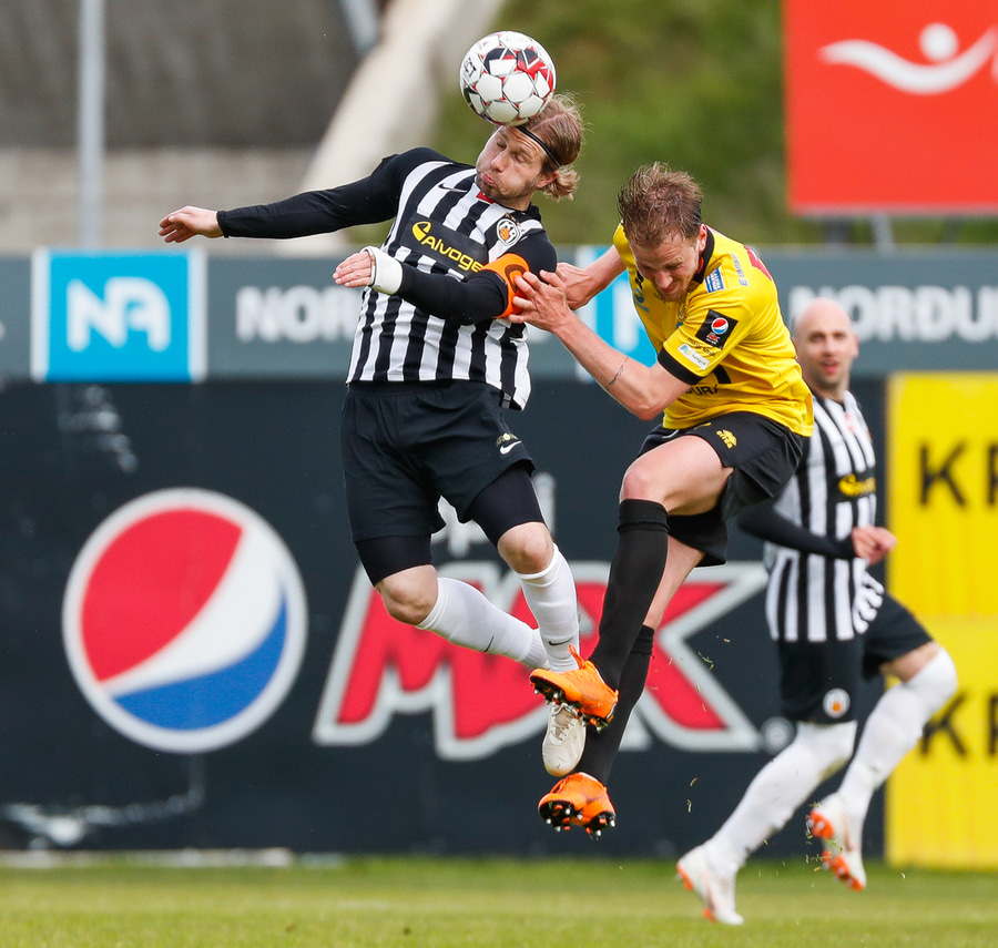 Skagamenn byrja á að lúðra boltanum upp og Arnór Snær fer í tæklingu og er tæklaður sömuleiðis af Arnþóri Inga rétt fyrir utan teiginn.