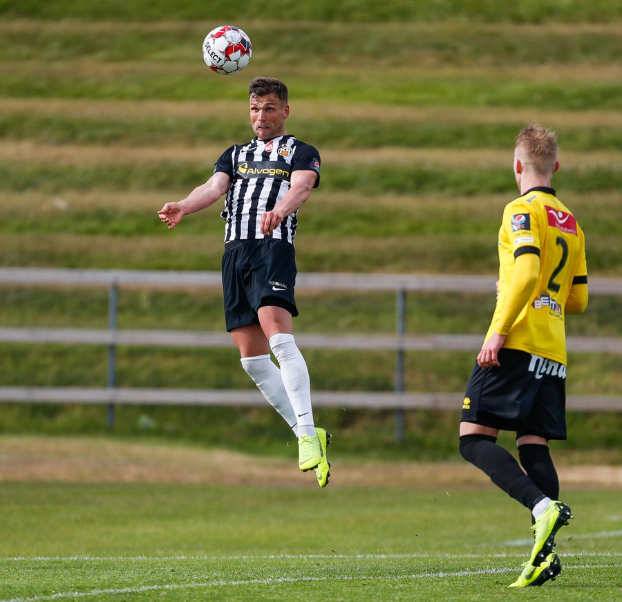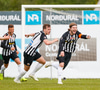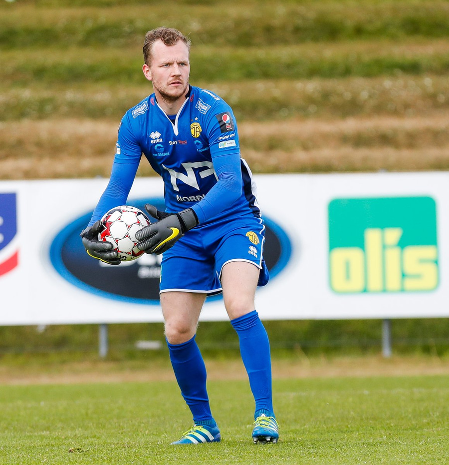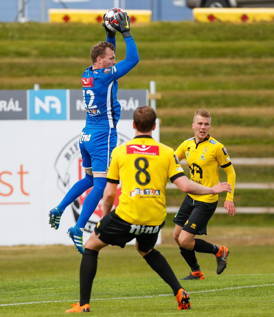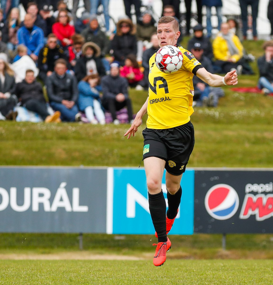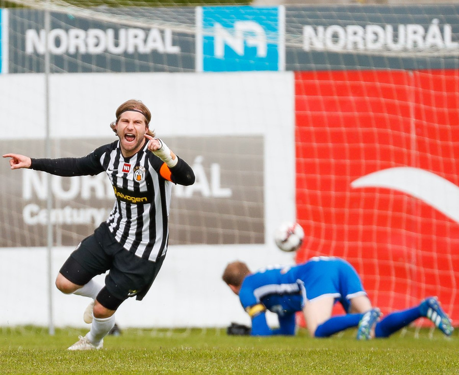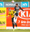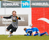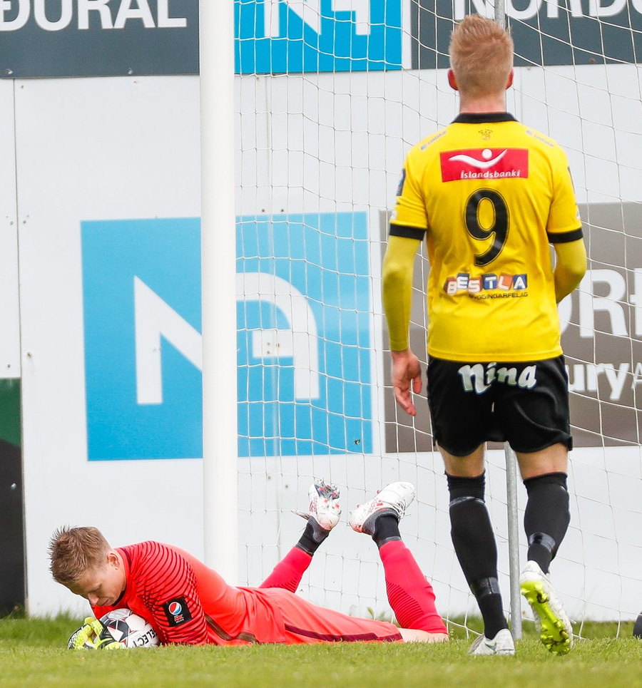 Hann neglir boltanum fast niðri á Óttar sem lyftir boltanum svo í átt að markinu en ofan á þaknetið.