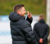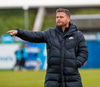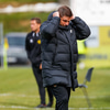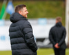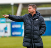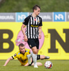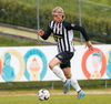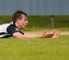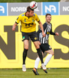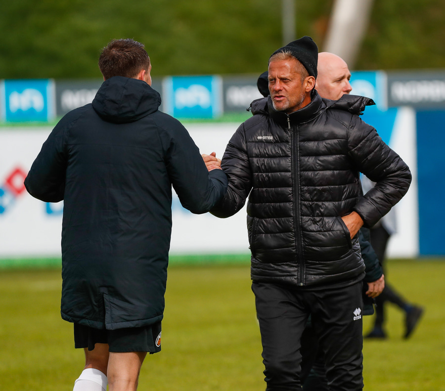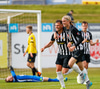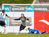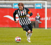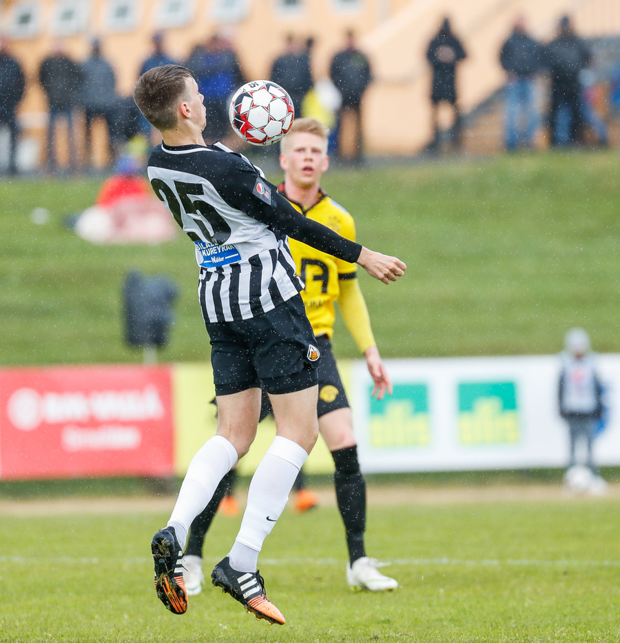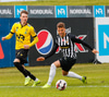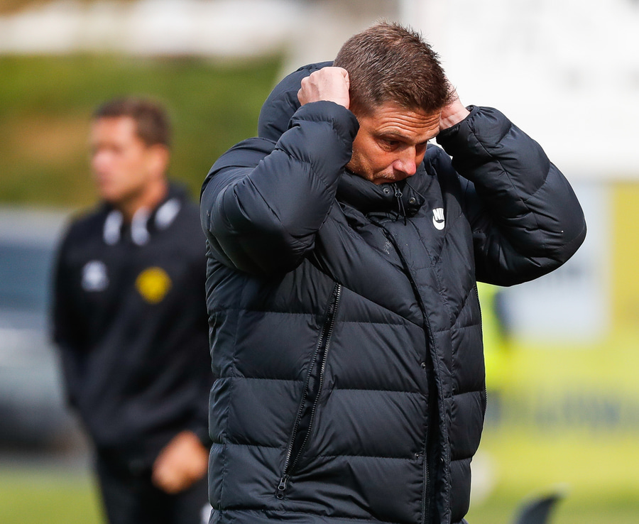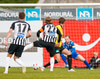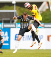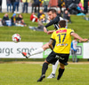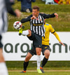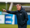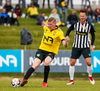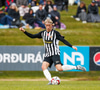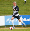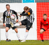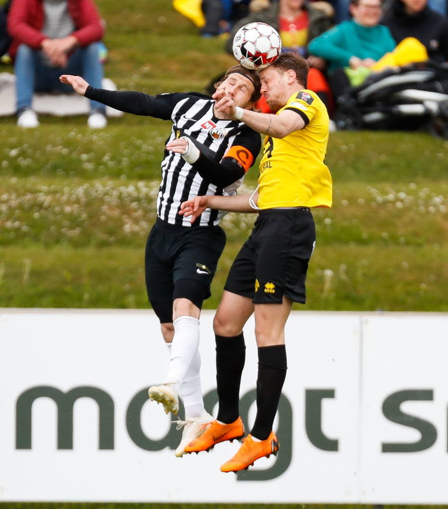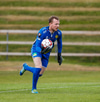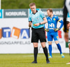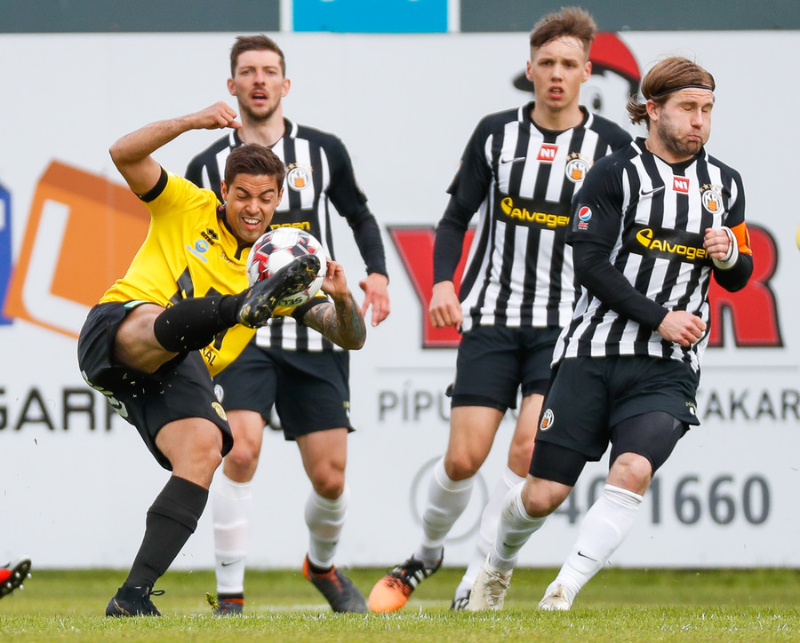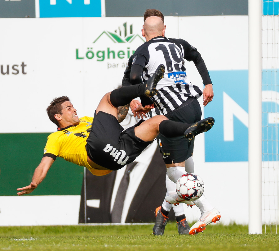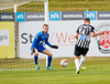 Hann neglir boltanum fast niðri á Óttar sem lyftir boltanum svo í átt að markinu en ofan á þaknetið.