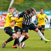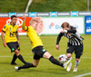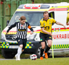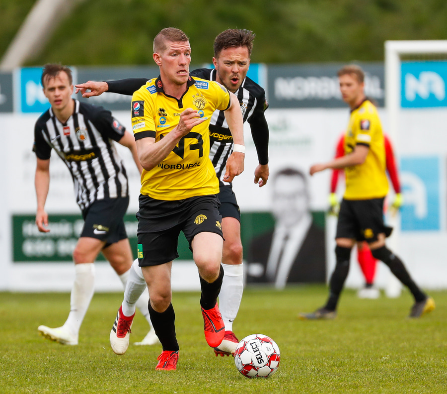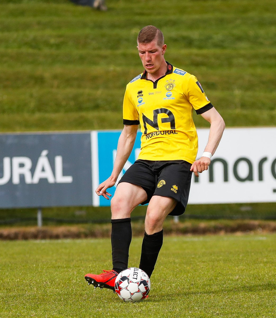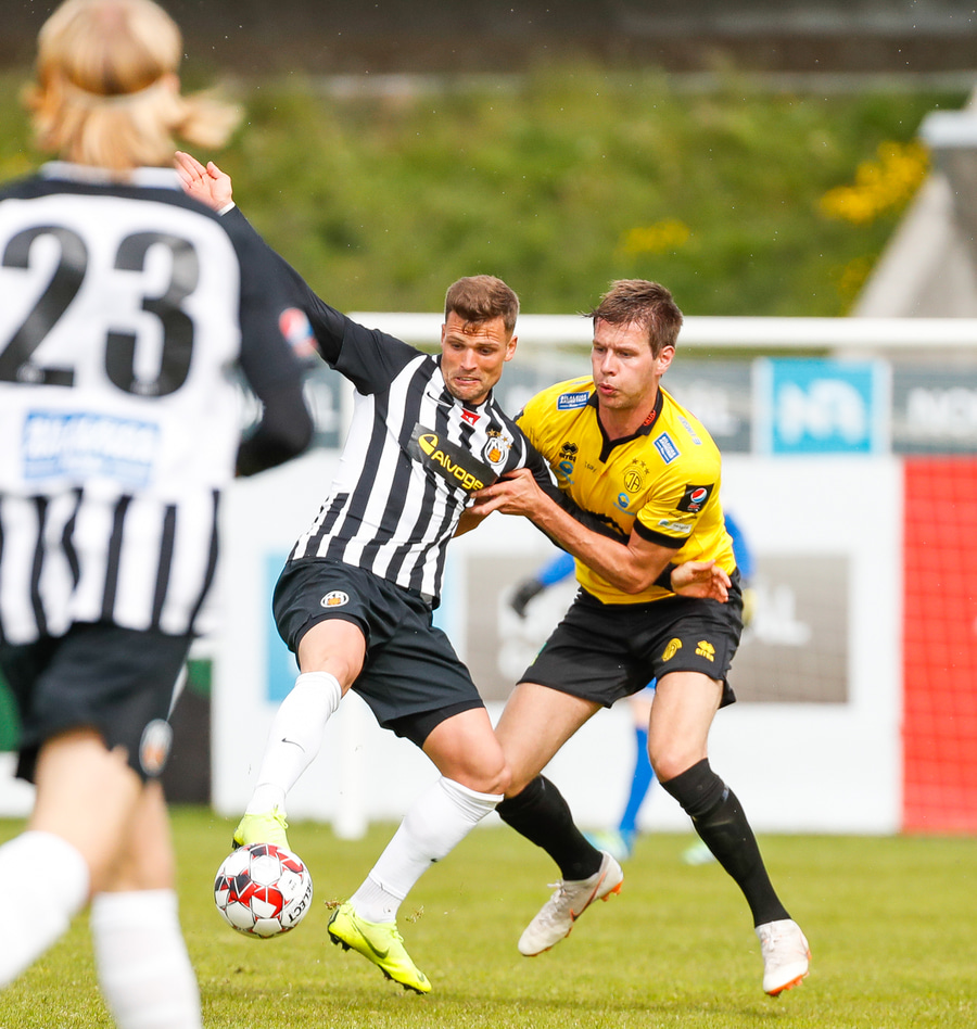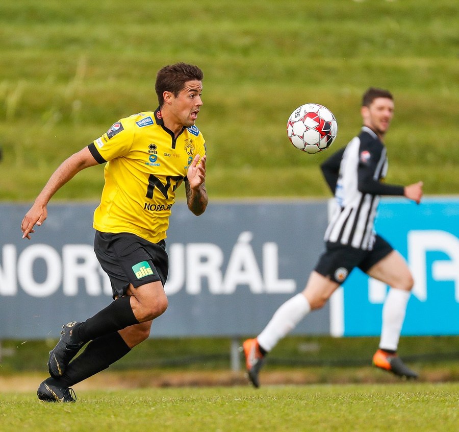 Atli Sigurjóns brýtur klaufalega á Alberti úti vinstra megin, Tryggvi Hrafn ætlar að taka þessa spyrnu.
