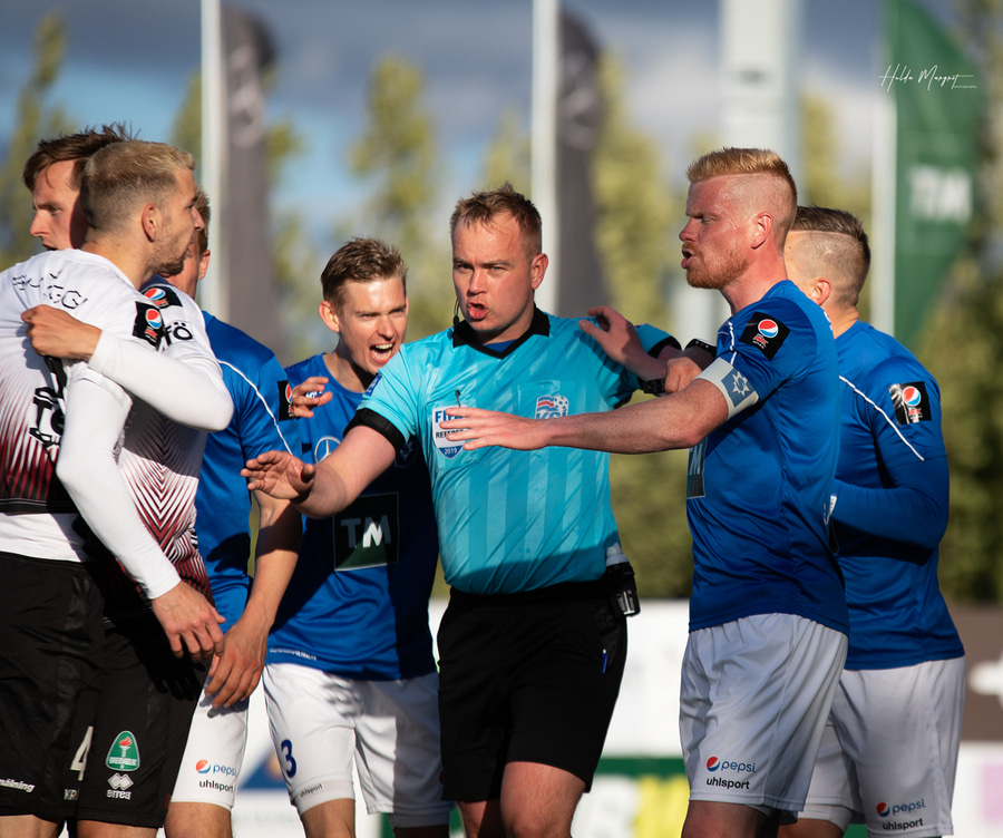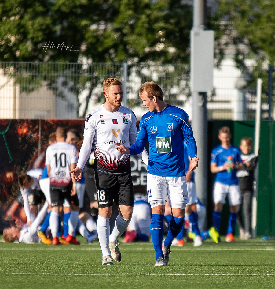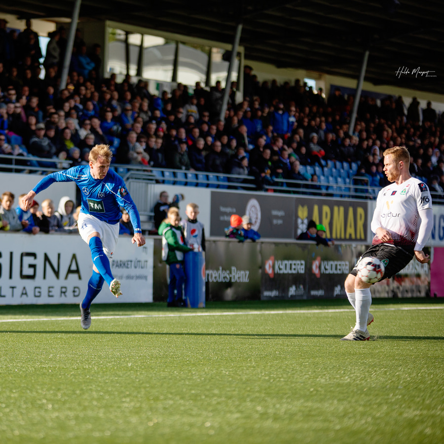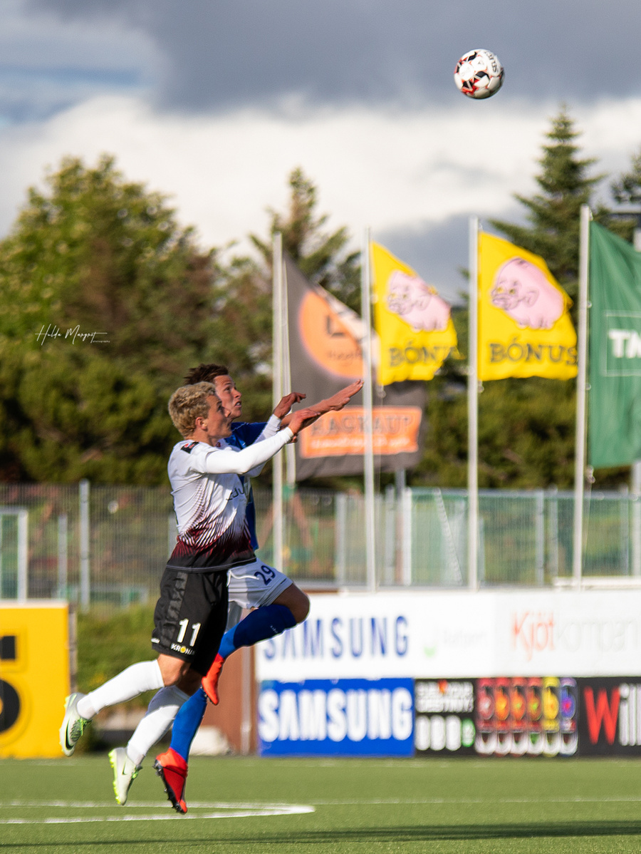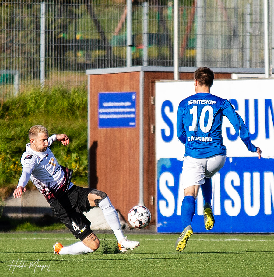 Heiðar fer hressilega í Höskuld hérna úti á kanti, svona korteri of seinn en sleppur við spjald. Fær spjald næst held ég að Þorvaldur hafi sagt við hann, heppinn Heiðar þarna.