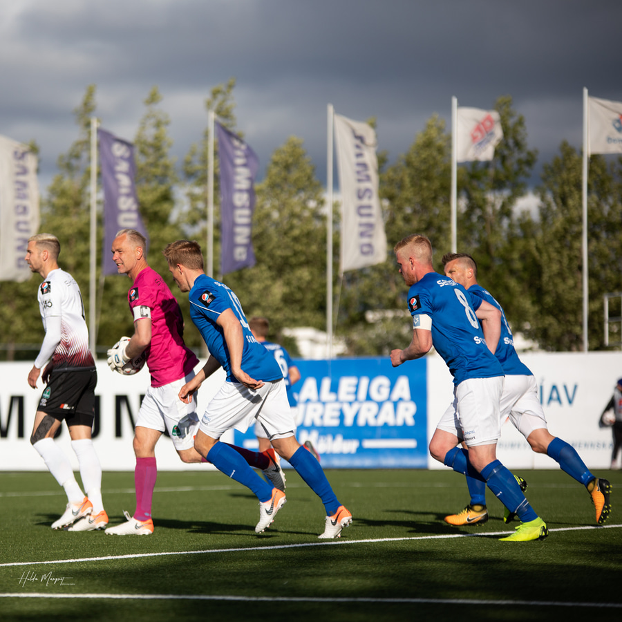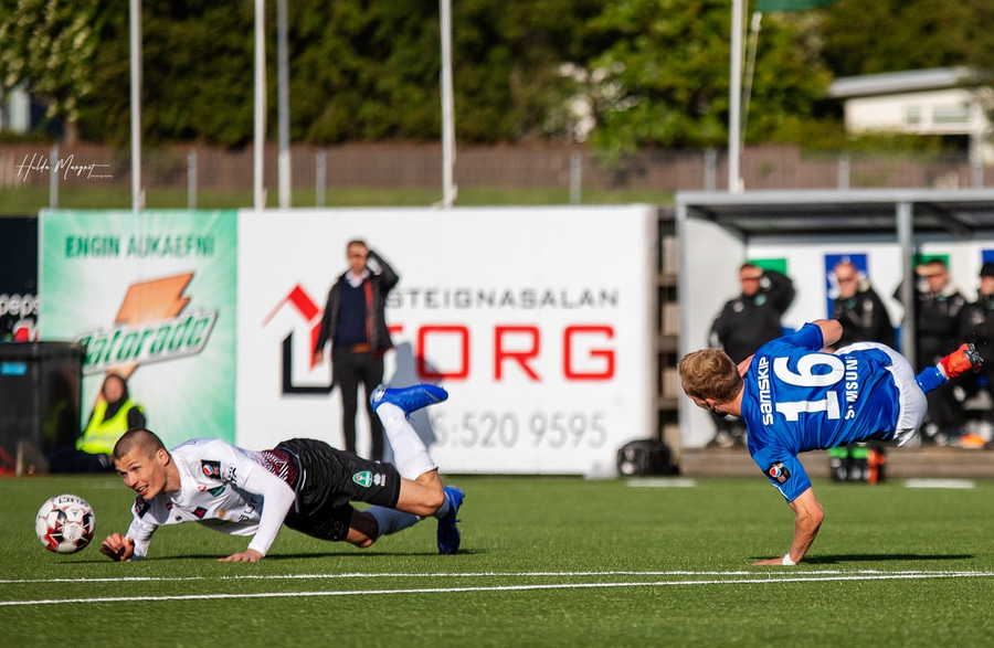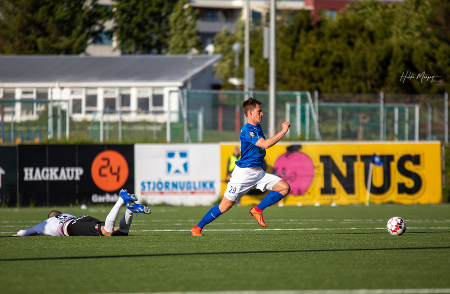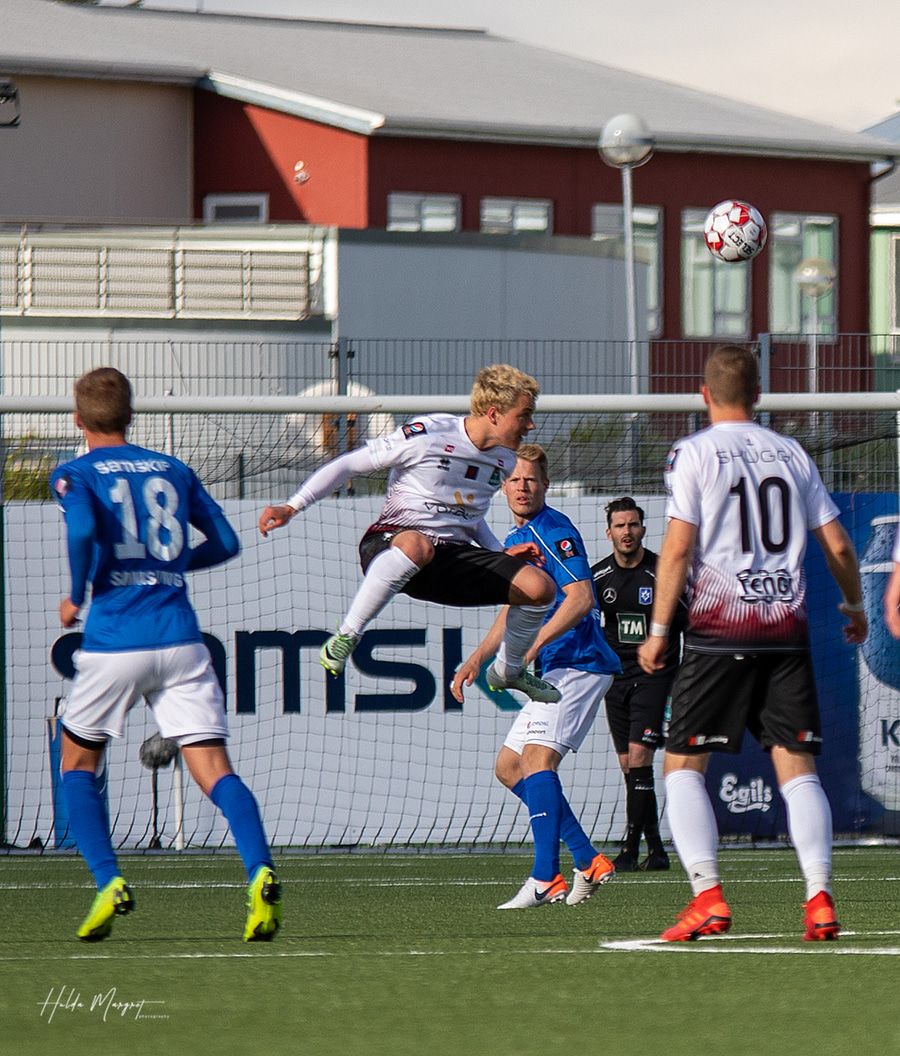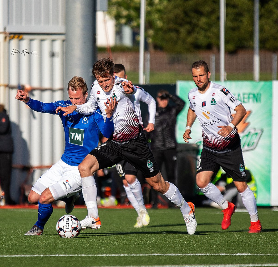 Heiðar fer hressilega í Höskuld hérna úti á kanti, svona korteri of seinn en sleppur við spjald. Fær spjald næst held ég að Þorvaldur hafi sagt við hann, heppinn Heiðar þarna.