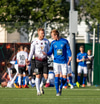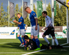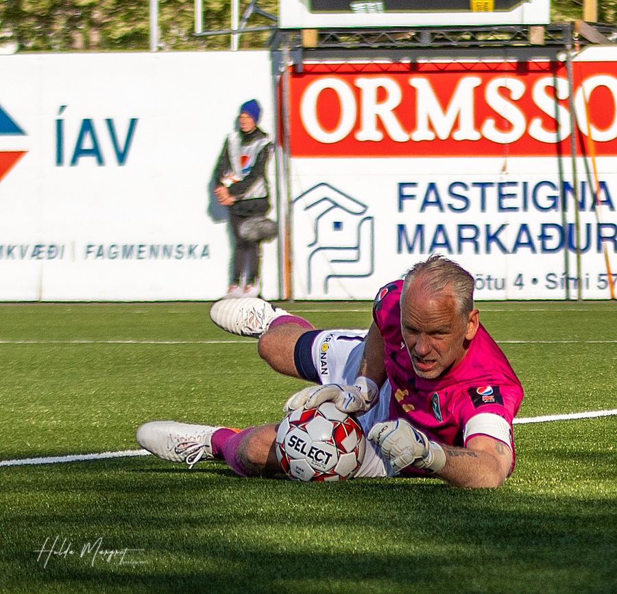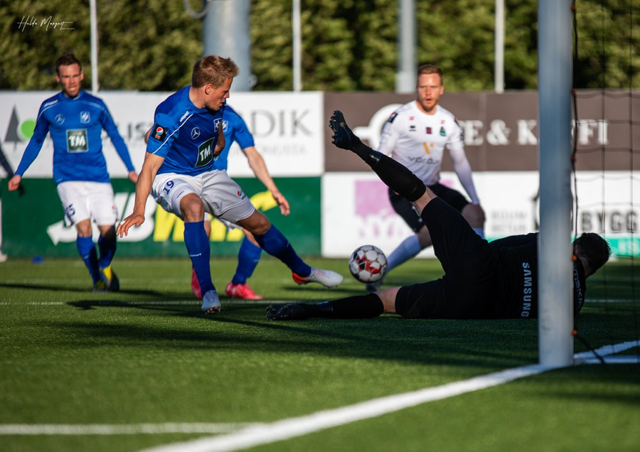 Hilmar með sendingu á Sölva sem kemst í skotið en Gulli ver mjög vel frá honum, gott skot og góð varsla.