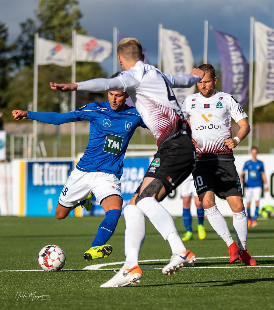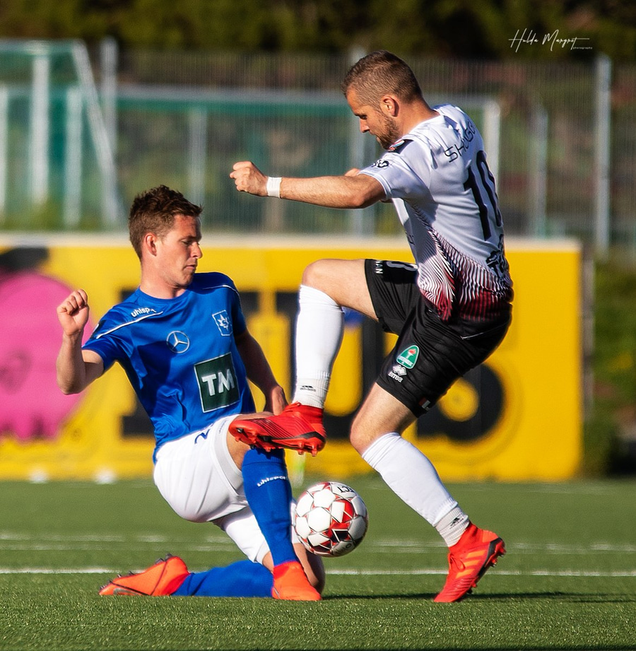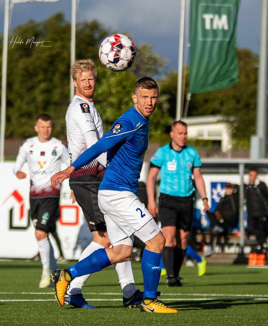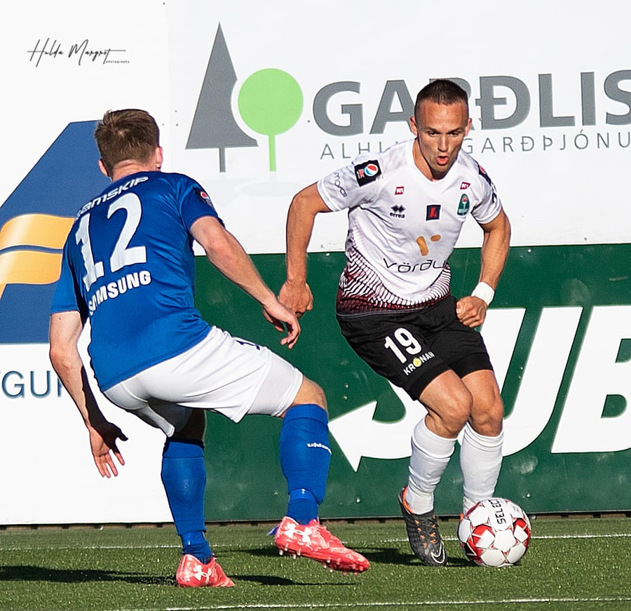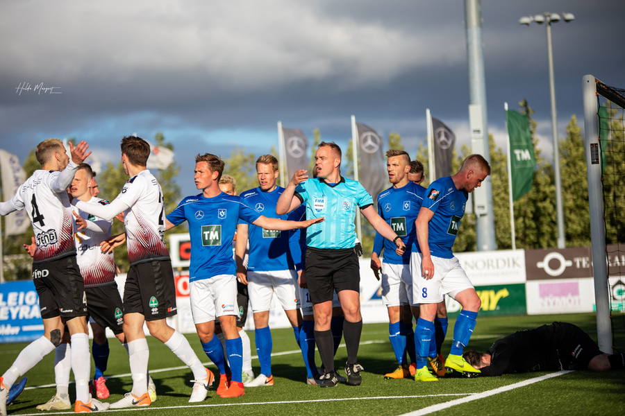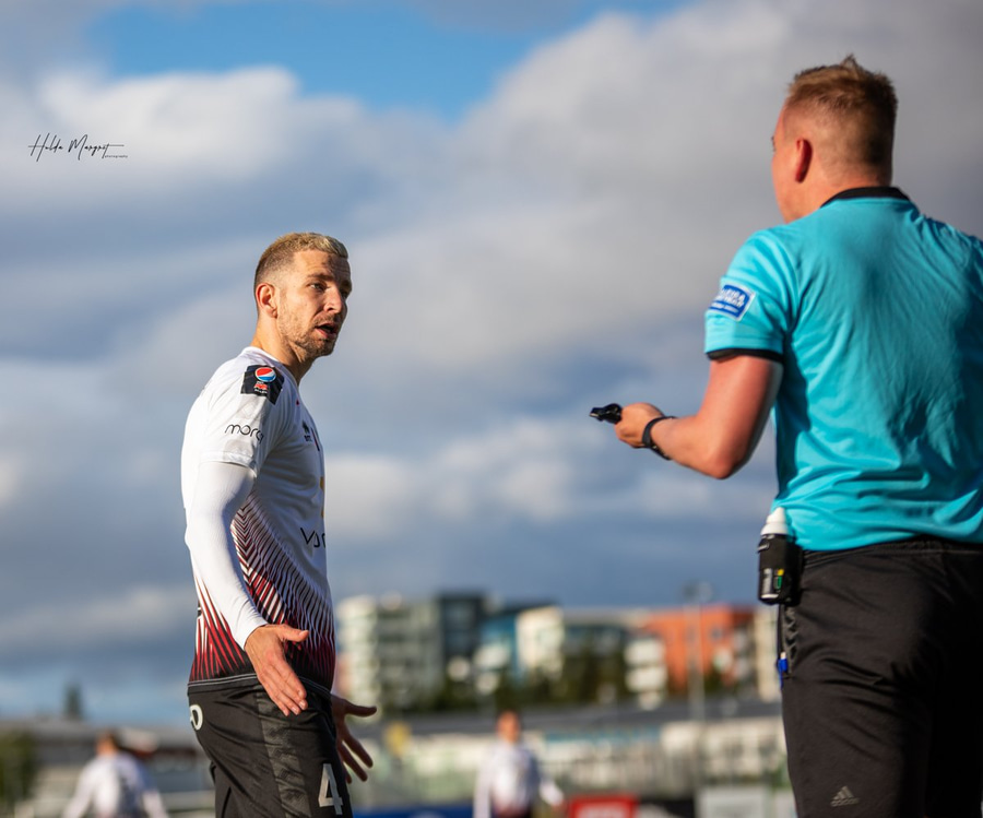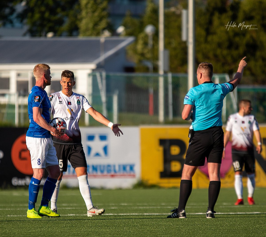 Damir fer fullgeyst í einvígi við Halla, setur takkana beint í hann eftir að Halli náði að slá boltann í horn. Gult spjald verðskuldað á Damir.