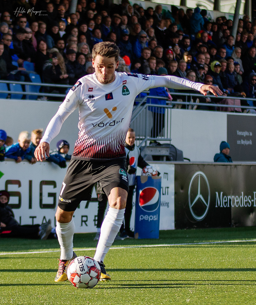 Hilmar með aukaspyrnu inná teiginn sem Guðmundur Steinn skallar yfir markið en hann var líka flaggaður rangstæður.