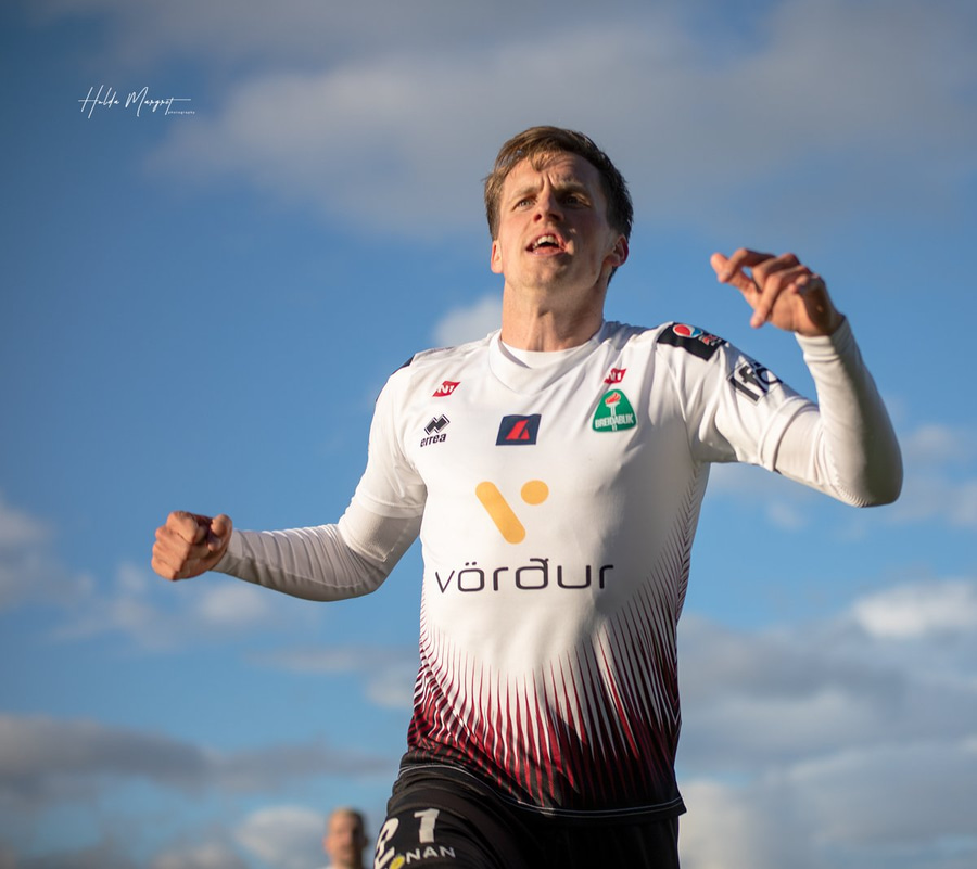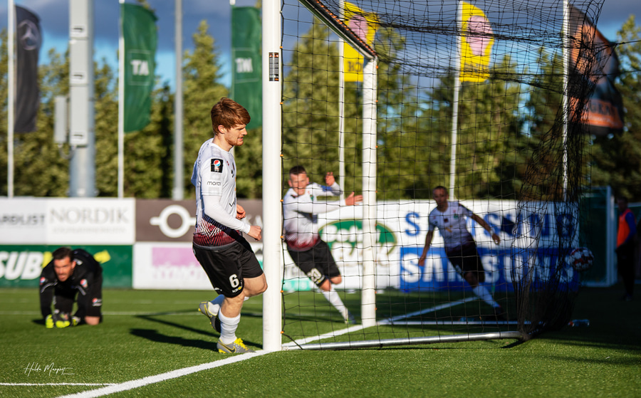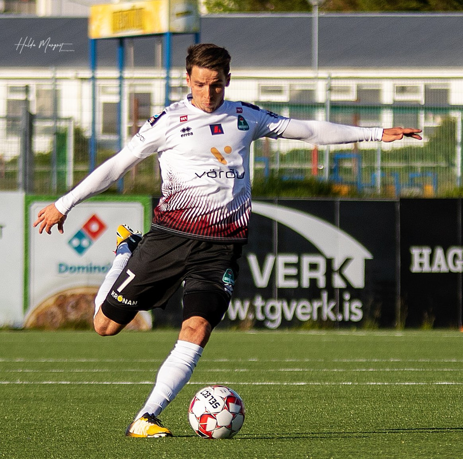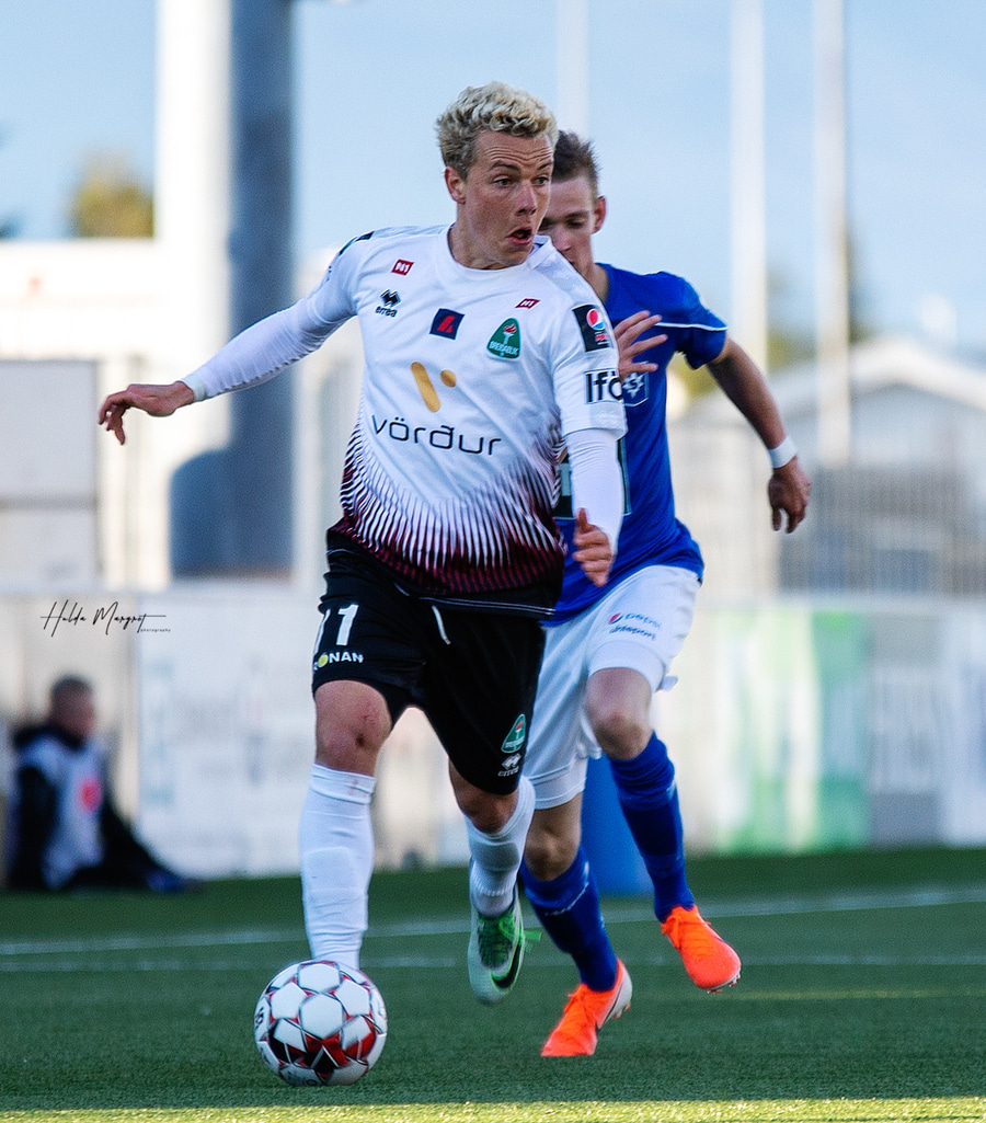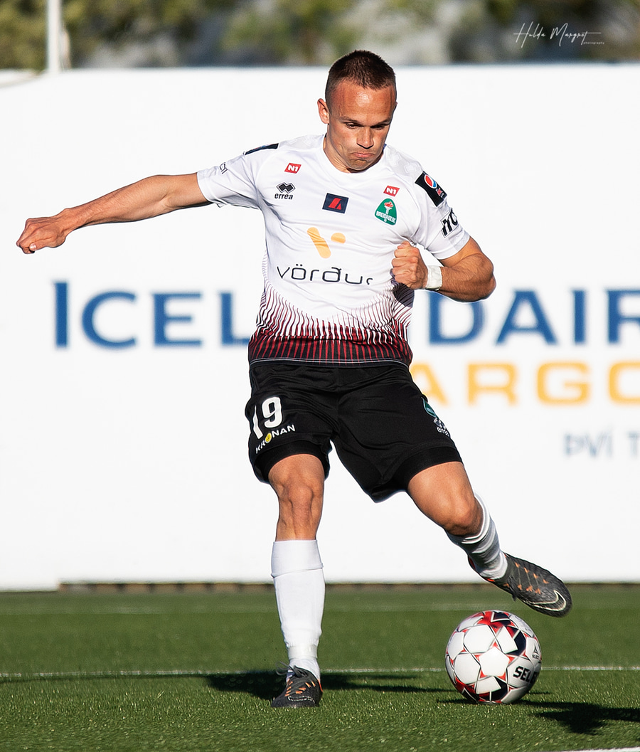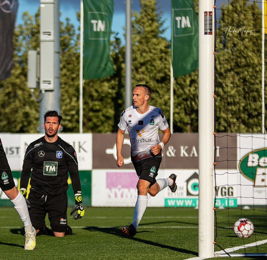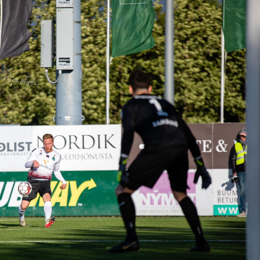 Arnar Sveinn með mjög góða sendingu inn fyrir á Mikkelsen sem er í þröngu færi en skot hans fer rétt framhjá markinu, munaði ekki miklu þarna.