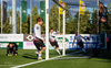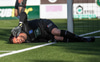 Hendrickx reynir fasta sendingu inná teig meðfram jörðina en sendingin fer í varnarmann og í fangið á Halla.