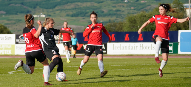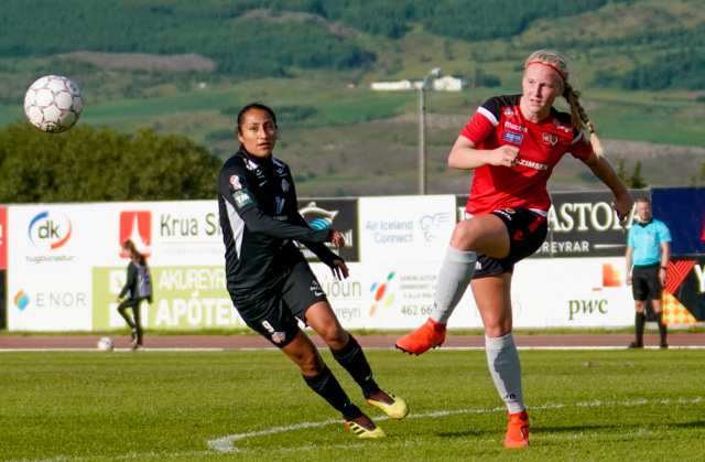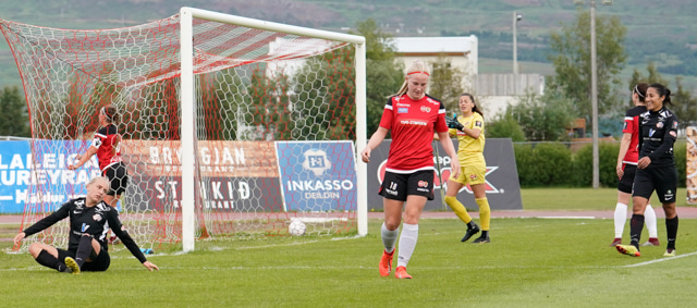 Enn einu sinni er Þór/KA við það að sleppa í gegn vinstra meginn en boltinn of fastur fyrir Þórdísi.