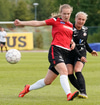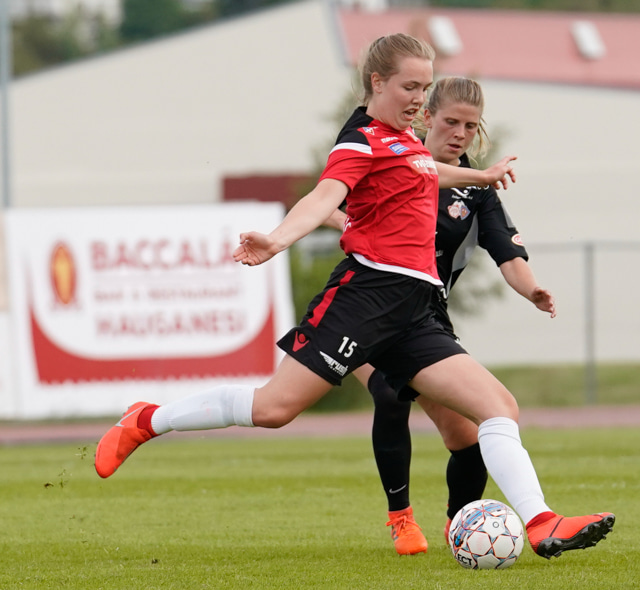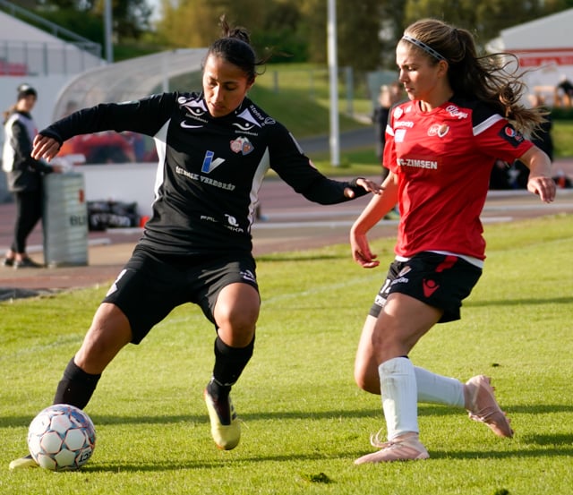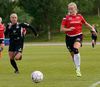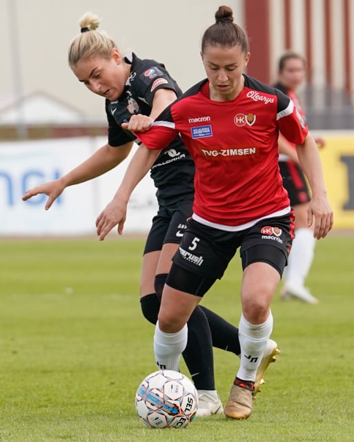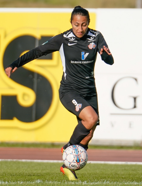 Svahildur búinn að byrja af krafti út á vinstri vængnum hjá HK/Víking, með frábæran bolta fyrir er boltinn skallaður burtu af Örnu Sif.