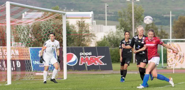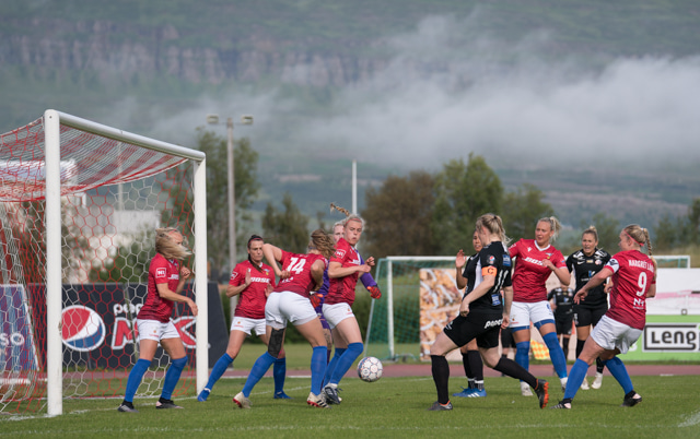 Bryndís hér í smá vandræðum með fyrirgjöf Fanndísar en Þór/KA ná að koma boltanum frá.