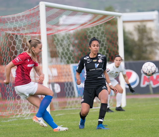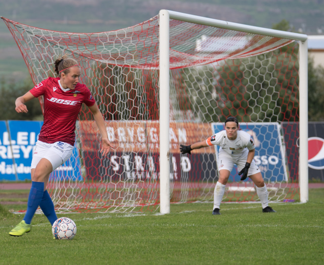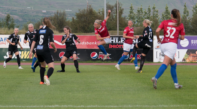 Heiða reynir hér að klippa boltann eftir fyrirgjöf Karenar en hittir boltann illa og hann fer beint í fangið á Söndru í markinu.