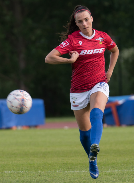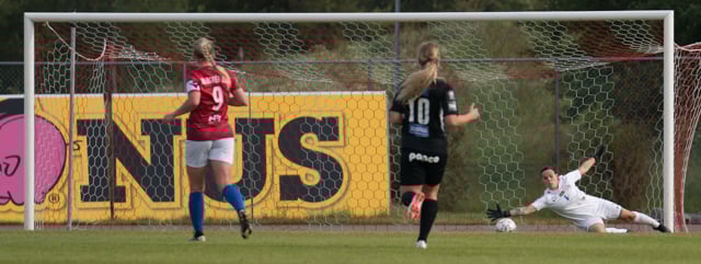 Sandra Mayor reynir skot fyrir utan teig en það er laust og beint á Söndru í markinu.
