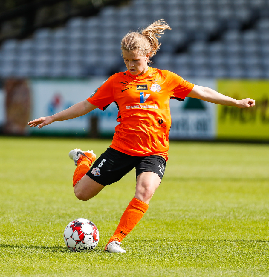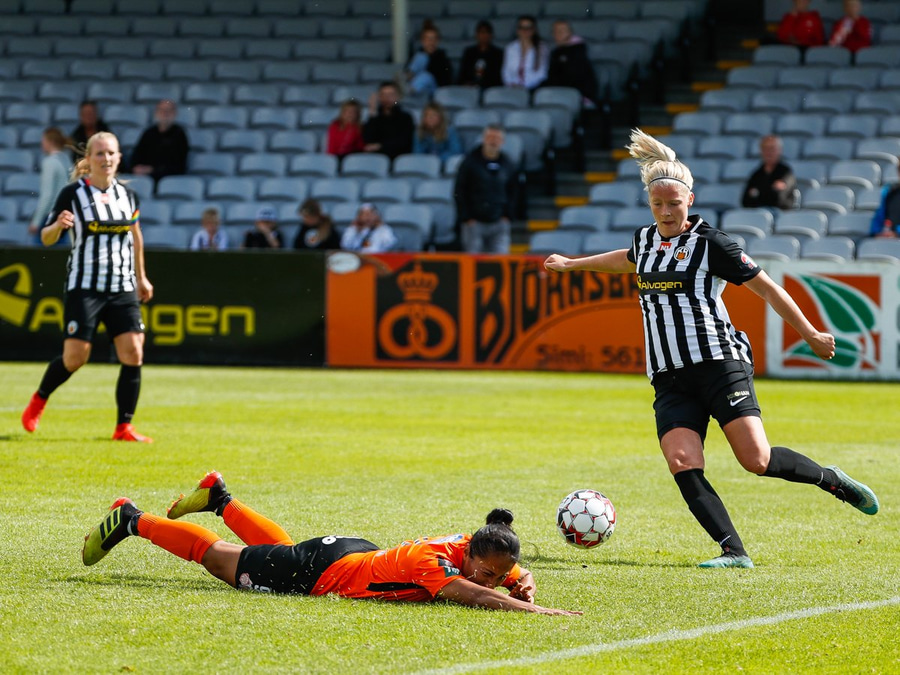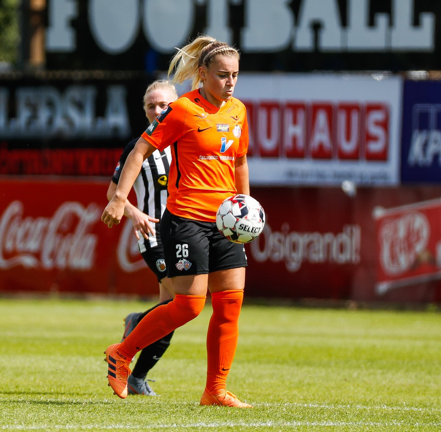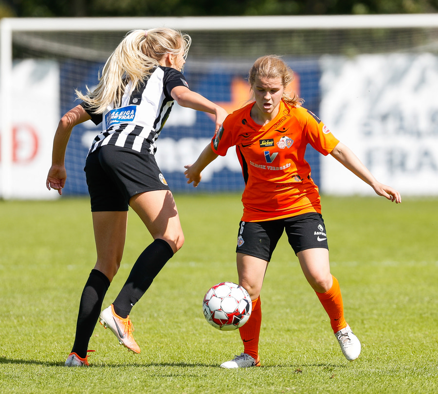 Hún vinnur boltann af Láru Kristínu og reynir svo fyrirgjöf sem fer af varnarmanni og í hliðarnetið.