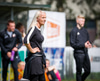 Ragna og Jóhannes Karl eru bæði staðin upp og standa fyrir utan varamannaskýlið hjá KR og ræða málin. Donni er líka staðinn upp sýnist hann vera að spóka sig aðeins í sólinni.