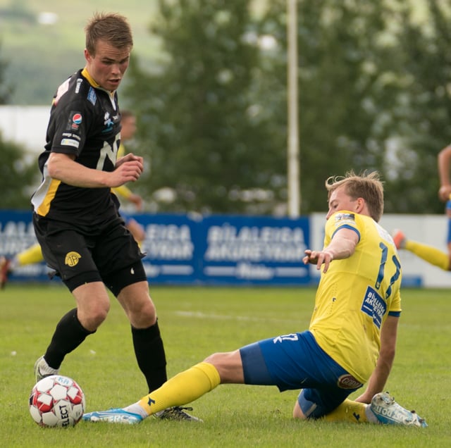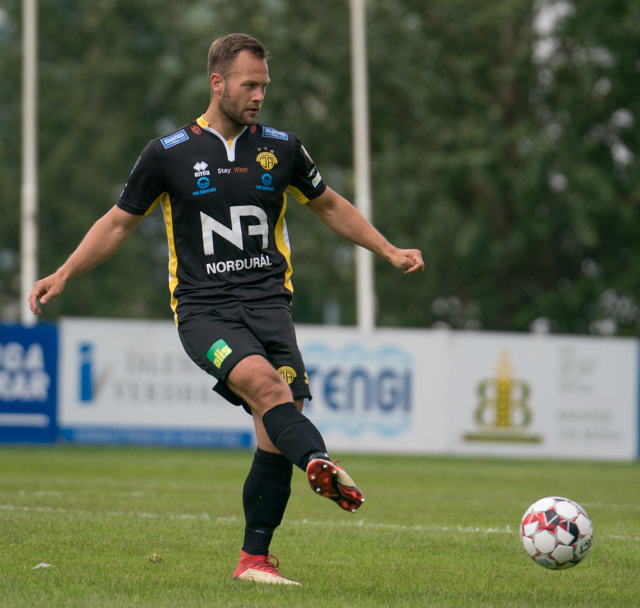 Almarr er hér dæmdur brotlegur rétt fyrir utan teig. Tryggvi Hrafn ætlar að taka spyrnuna.