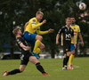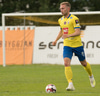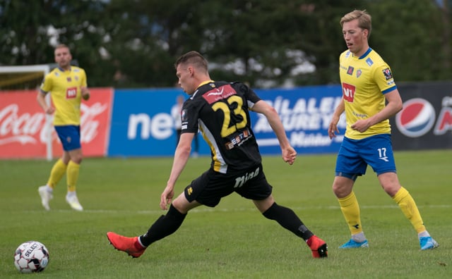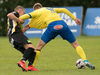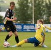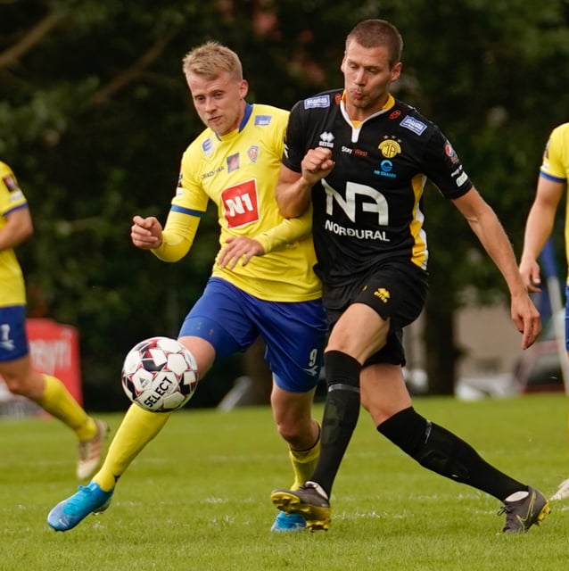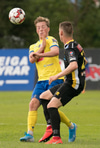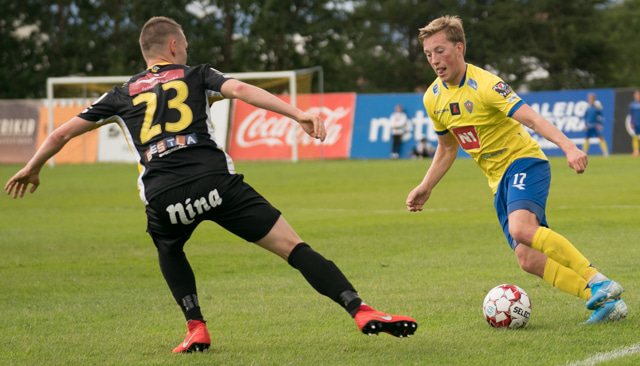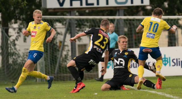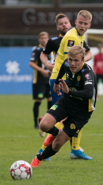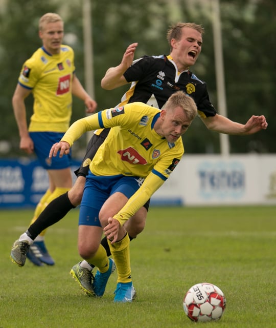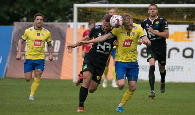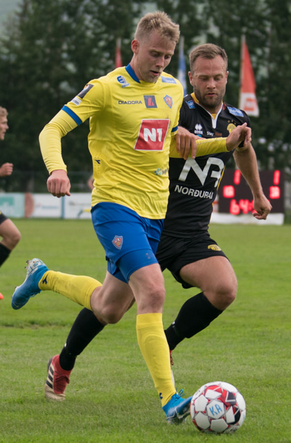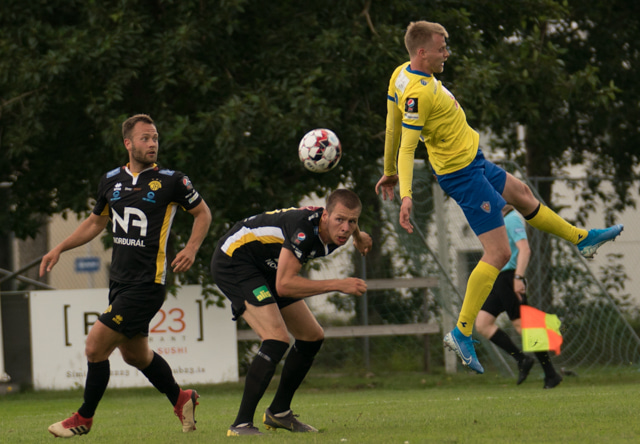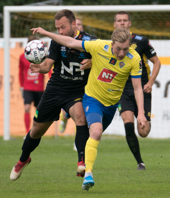 Jón Gísli Eyland kemst hér inní sendingu Iosu og á hættulega sendingu ætlaða Tryggva en Aron Dagur er fljótur úr markinu og hirðir boltann.