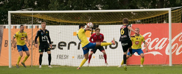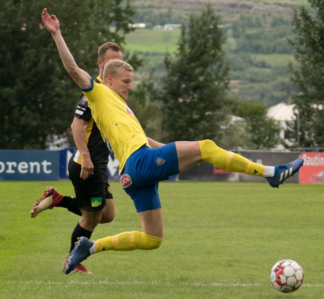 Stefán Teitur tekur langt innkast inná teig KA manna þar sem að verður klafs. Það endar með því að Aron Dagur dettur einhvernveginn á boltann sem að er sentímetrum frá því að vera fyrir innan.