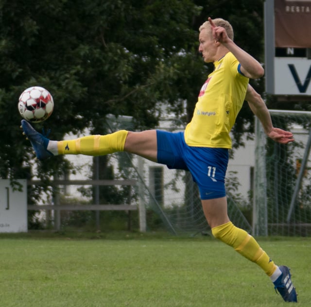 Ívar Örn með langt innkast sem að Nökkvi flikkar aftur fyrir sig en það fer beint í fangið á Árna.