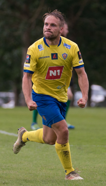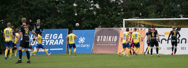 Stefán Teitur tekur hér aukaspyrnu inná teiginn þar sem að Viktor er einn á auðum sjó og stangar boltann í netið. Ekki góður varnarleikur hjá KA þarna.