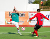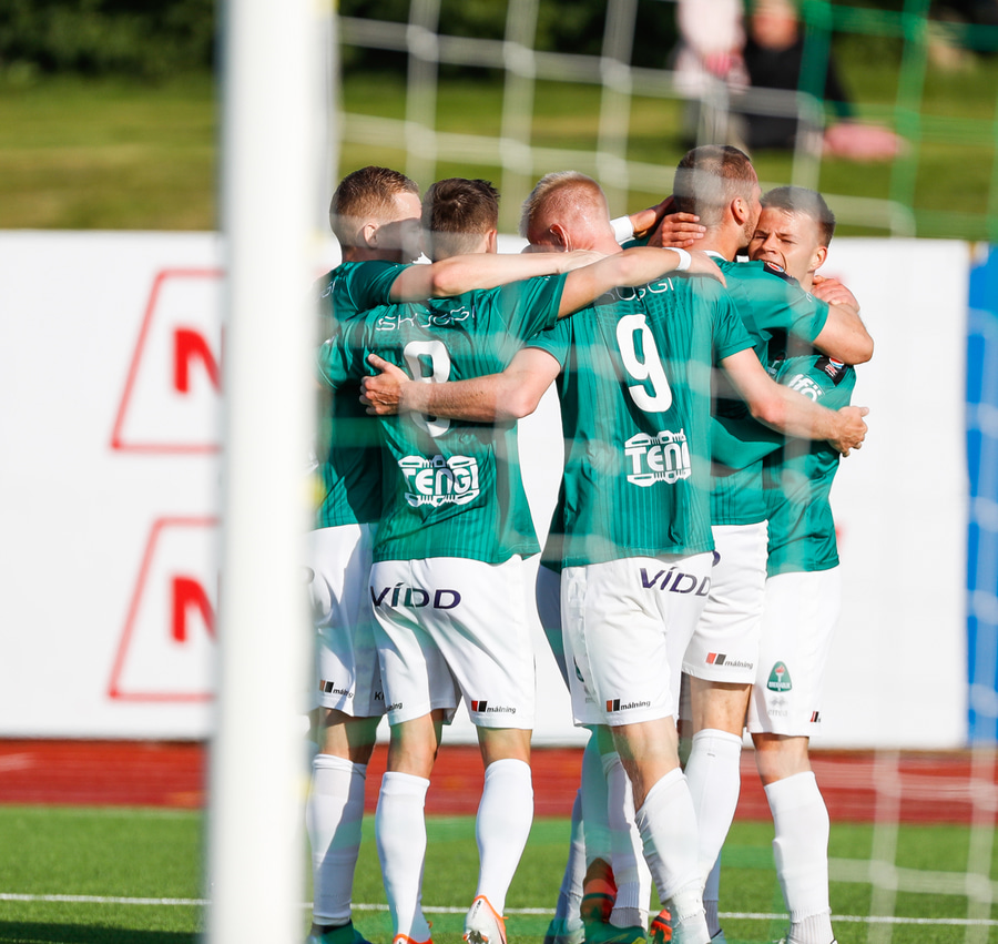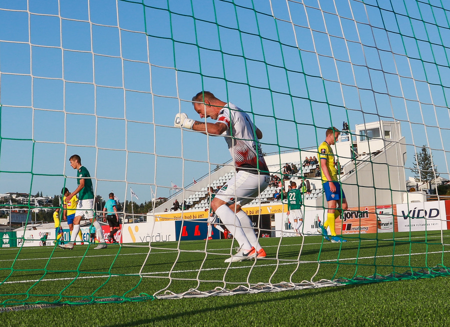 Elfar með stungusendingu á Ásgeir sem skýtur meðfram jörðinni en rétt fram hjá stönginni. Liggur svo eftir að hafa lent í Viktori Erni eftir skotið.