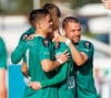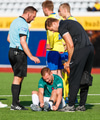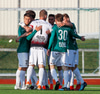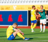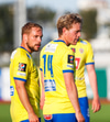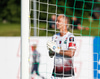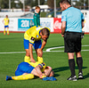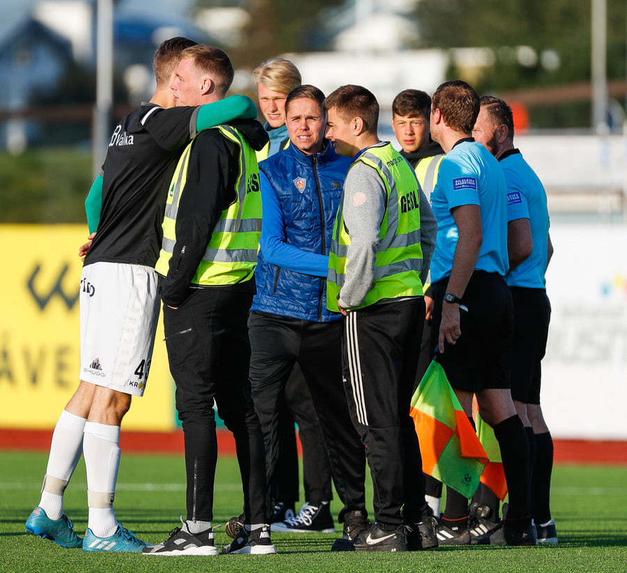 Aron Dagur liggur sárþjáður eftir og það eru komnar börur inná völlinn, Jajalo er að koma inná hér. Virðist hafa lent í samstuði við Mikkelsen í markinu. Aron kemur því miður útaf á börum, óskum honum skjóts bata.