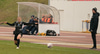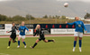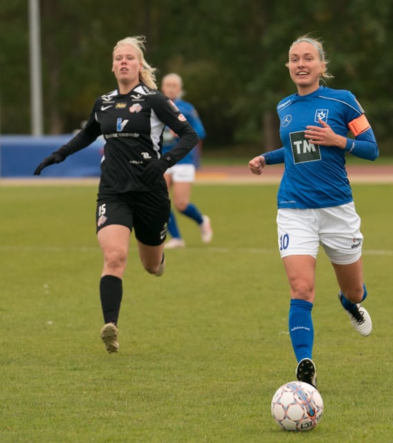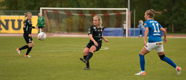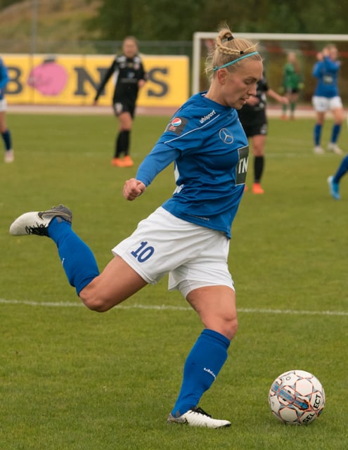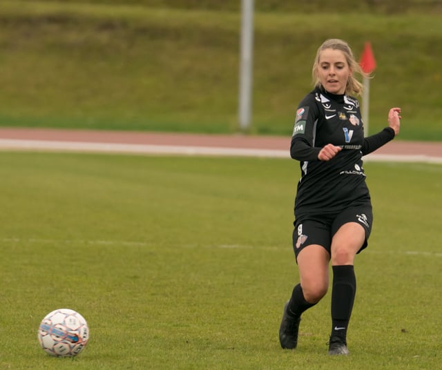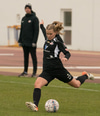 Sóley reynir hér fyrirgjöf frá vinstri en hittir ekki boltann og setur hann fast í hliðarnetið. Flokkum þetta bara sem skot, jájá.