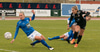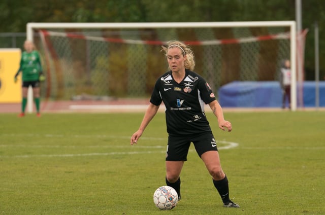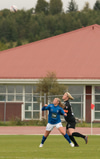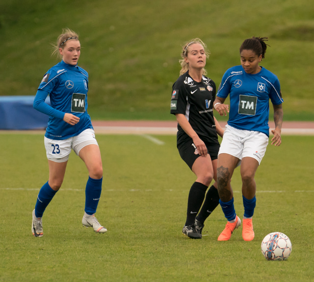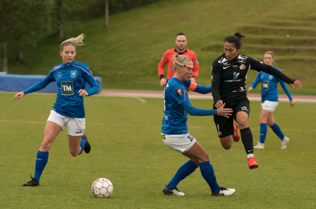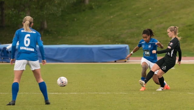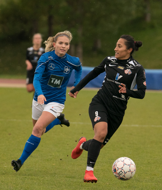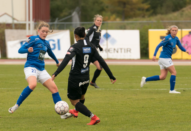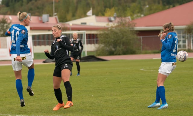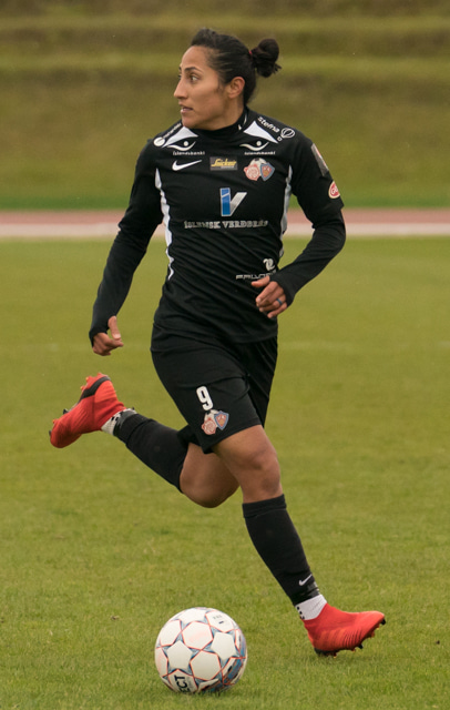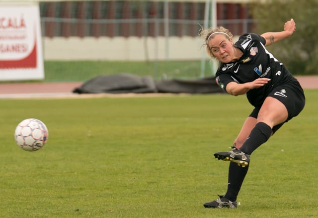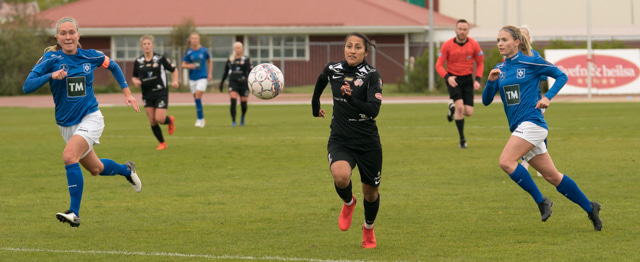 Sandra Mayor tekur boltann á lofti í teignum en...skýtur framhjá. Saga leiksins hingað til.