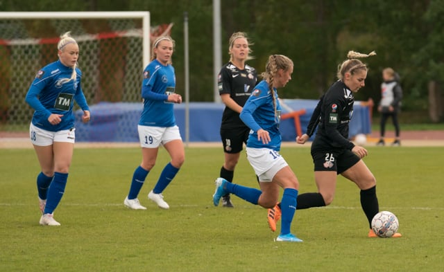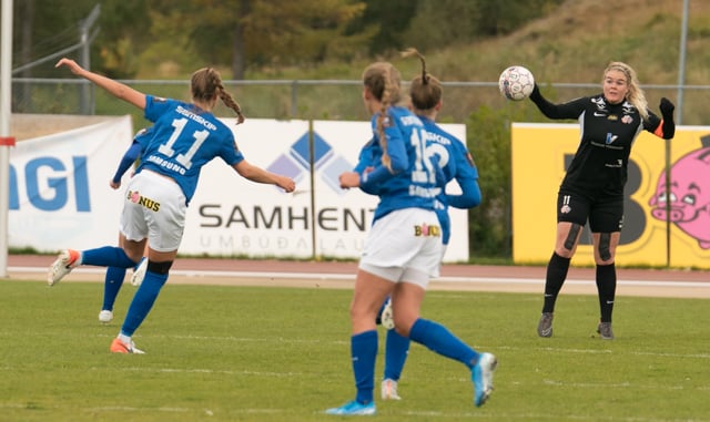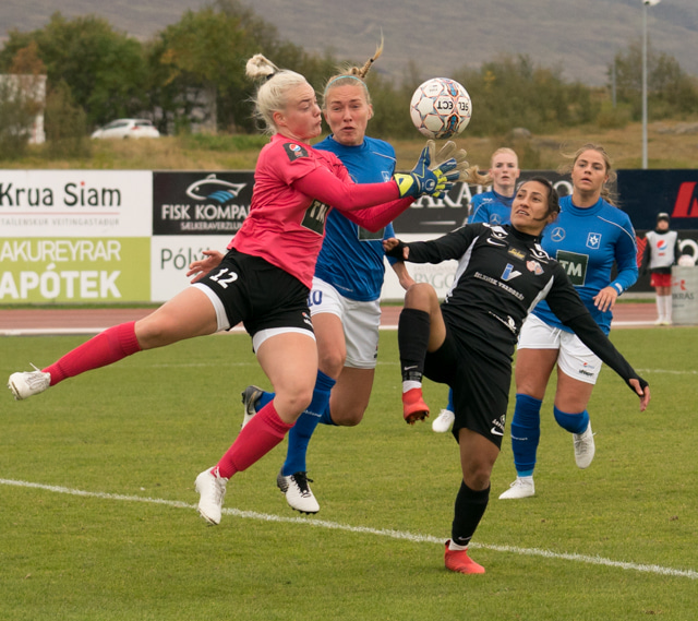 Andrea Mist tekur hornspyrnu og setur boltann á markteiginn, þar rís Birta hæst og handsamar boltann. Vel gert, hún var umkringd svörtum treyjum!